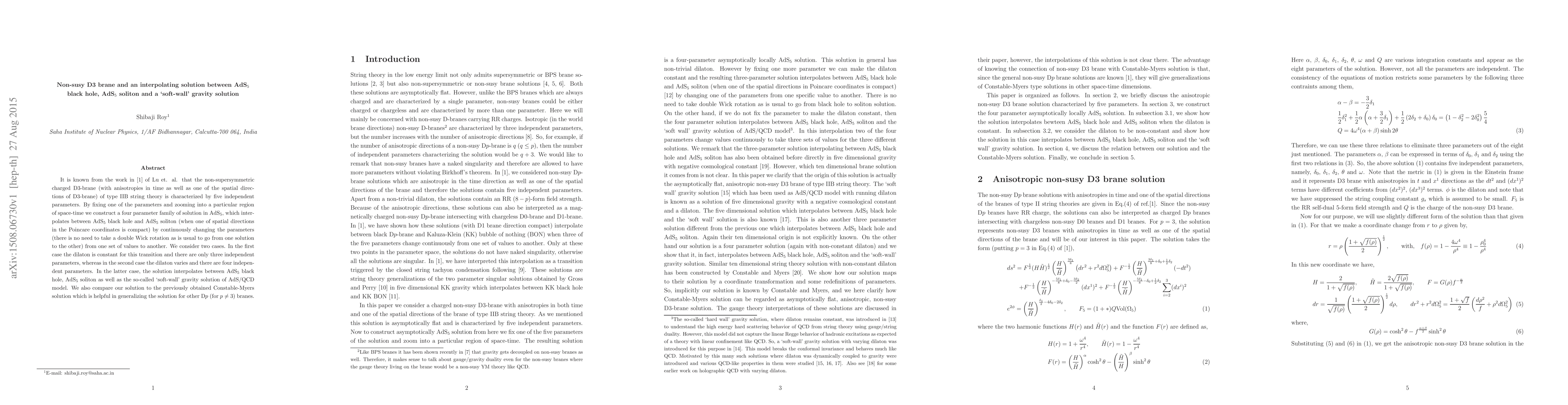 This paper constructs a four-parameter family of solutions in AdS$_5$ from a non-supersymmetric D3-brane, interpolating between AdS$_5$ black hole, AdS$_5$ soliton, and a 'soft-wall' gravity solution without double Wick rotation. It compares these solutions to the Constable-Myers solution for generalization to other D$p$ branes.