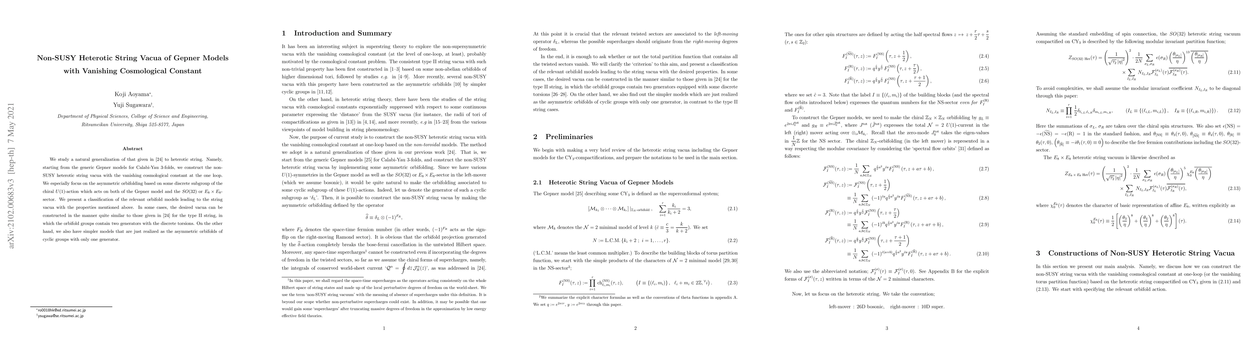 This paper explores non-SUSY heterotic string vacua derived from Gepner models with a vanishing cosmological constant. It focuses on asymmetric orbifolding techniques based on discrete $U(1)$-actions and classifies the resulting models, highlighting similarities and differences to type II string constructions.
