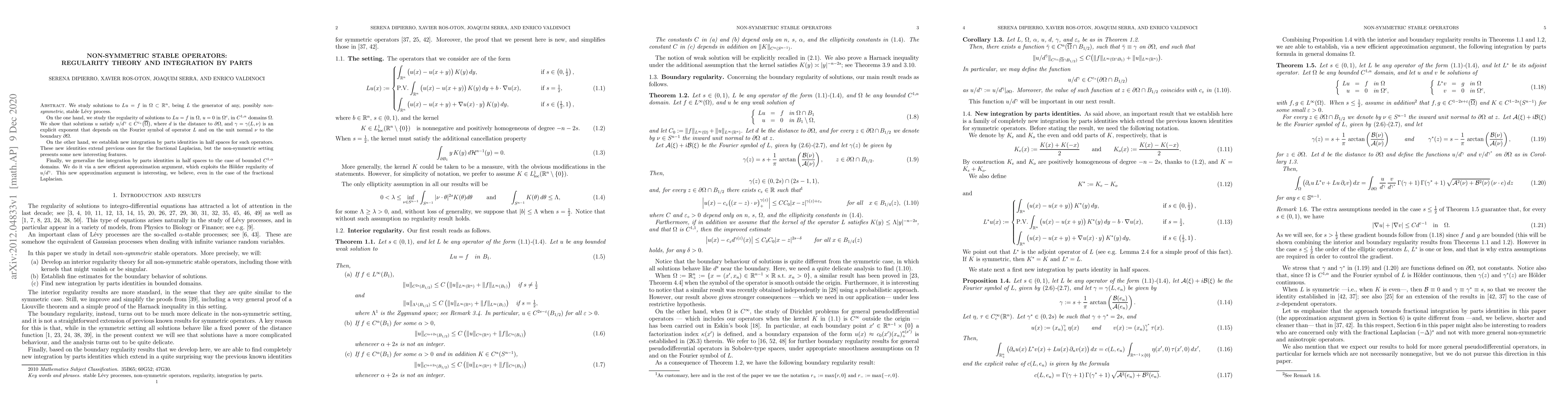 We study solutions to $Lu=f$ in $\Omega\subset\mathbb R^n$, being $L$ the generator of any, possibly non-symmetric, stable L\'evy process. On the one hand, we study the regularity of solutions to $Lu=f$ in $\Omega$, $u=0$ in $\Omega^c$, in $C^{1,\alpha}$ domains~$\Omega$. We show that solutions $u$ satisfy $u/d^\gamma\in C^{\varepsilon_\circ}\big(\overline\Omega\big)$, where $d$ is the distance to $\partial\Omega$, and $\gamma=\gamma(L,\nu)$ is an explicit exponent that depends on the Fourier symbol of operator $L$ and on the unit normal $\nu$ to the boundary $\partial\Omega$. On the other hand, we establish new integration by parts identities in half spaces for such operators. These new identities extend previous ones for the fractional Laplacian, but the non-symmetric setting presents some new interesting features. Finally, we generalize the integration by parts identities in half spaces to the case of bounded $C^{1,\alpha}$ domains. We do it via a new efficient approximation argument, which exploits the H\"older regularity of $u/d^\gamma$. This new approximation argument is interesting, we believe, even in the case of the fractional Laplacian.