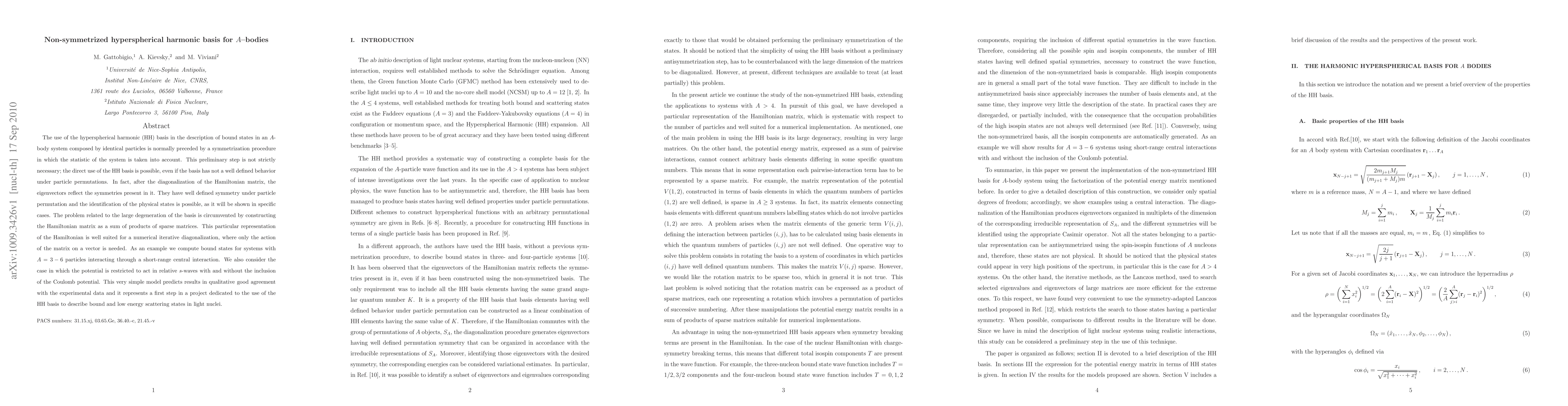 The use of the hyperspherical harmonic (HH) basis in the description of bound states in an $A$-body system composed by identical particles is normally preceded by a symmetrization procedure in which the statistic of the system is taken into account. This preliminary step is not strictly necessary; the direct use of the HH basis is possible, even if the basis has not a well defined behavior under particle permutations. In fact, after the diagonalization of the Hamiltonian matrix, the eigenvectors reflect the symmetries present in it. They have well defined symmetry under particle permutation and the identification of the physical states is possible, as it will be shown in specific cases. The problem related to the large degeneration of the basis is circumvented by constructing the Hamiltonian matrix as a sum of products of sparse matrices. This particular representation of the Hamiltonian is well suited for a numerical iterative diagonalization, where only the action of the matrix on a vector is needed. As an example we compute bound states for systems with $A=3-6$ particles interacting through a short-range central interaction. We also consider the case in which the potential is restricted to act in relative s-waves with and without the inclusion of the Coulomb potential. This very simple model predicts results in qualitative good agreement with the experimental data and it represents a first step in a project dedicated to the use of the HH basis to describe bound and low energy scattering states in light nuclei.