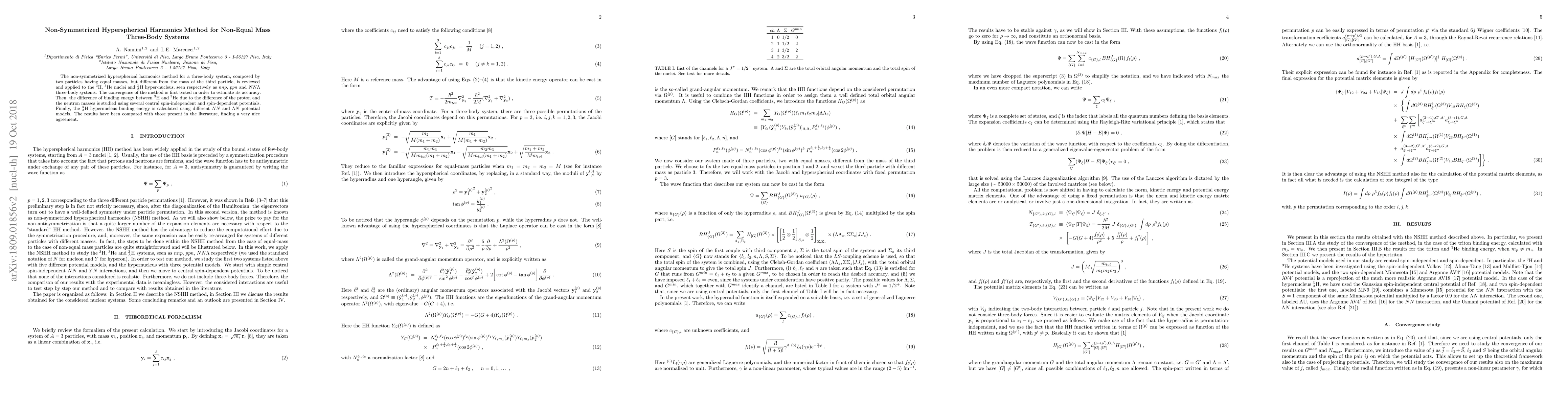 The non-symmetrized hyperspherical harmonics method for a three-body system, composed by two particles having equal masses, but different from the mass of the third particle, is reviewed and applied to the $^3$H, $^3$He nuclei and $^3_{\Lambda}$H hyper-nucleus, seen respectively as $nnp$, $ppn$ and $NN\Lambda$ three-body systems. The convergence of the method is first tested in order to estimate its accuracy. Then, the difference of binding energy between $^3$H and $^3$He due to the difference of the proton and the neutron masses is studied using several central spin-independent and spin-dependent potentials. Finally, the $^3_{\Lambda}$H hypernucleus binding energy is calculated using different $NN$ and $\Lambda N$ potential models. The results have been compared with those present in the literature, finding a very nice agreement.