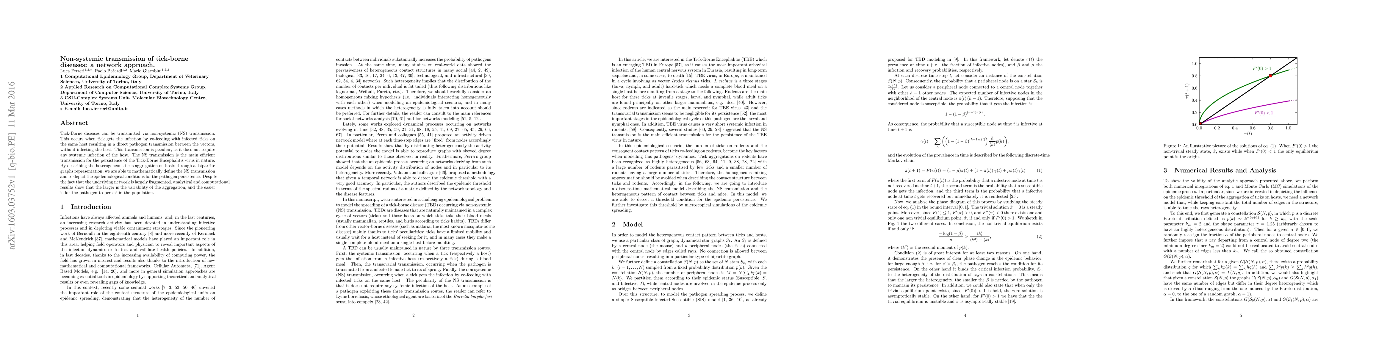 This paper explores non-systemic transmission of tick-borne diseases through co-feeding on the same host, using a network approach to model the persistence of Tick-Borne Encephalitis virus. The study finds that greater variability in tick aggregation enhances pathogen persistence despite a fragmented network.