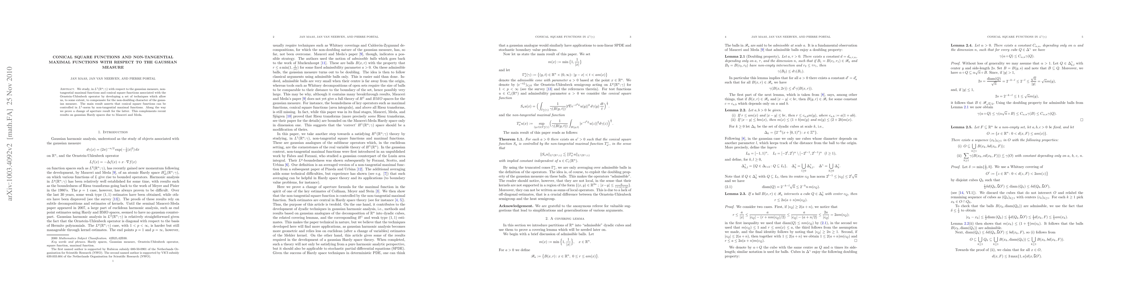 This paper investigates non-tangential maximal functions and conical square functions in $L^{1}(\R^n;\gamma)$ with respect to the Gaussian measure, addressing the non-doubling nature of the measure. The main finding is that conical square functions can be controlled by non-tangential maximal functions, with a change of aperture result for the latter complementing recent work on Gaussian Hardy spaces.