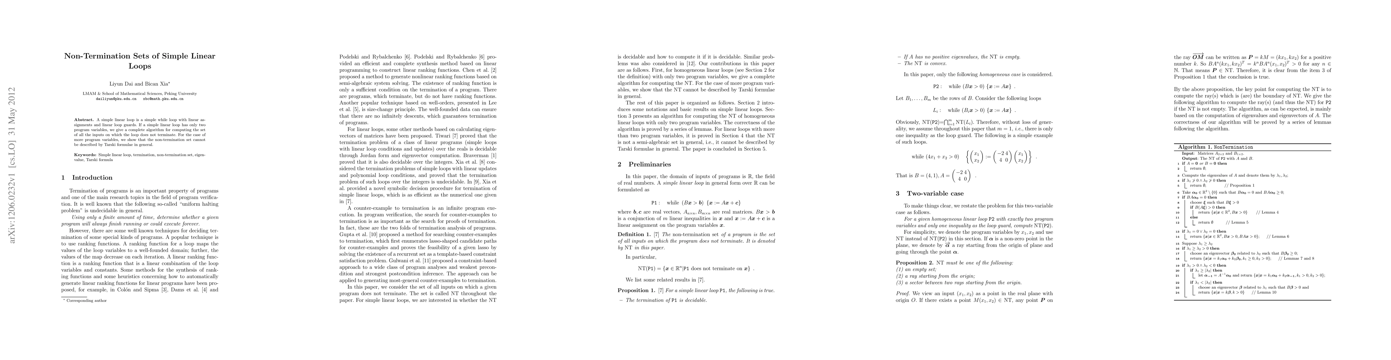 A simple linear loop is a simple while loop with linear assignments and linear loop guards. If a simple linear loop has only two program variables, we give a complete algorithm for computing the set of all the inputs on which the loop does not terminate. For the case of more program variables, we show that the non-termination set cannot be described by Tarski formulae in general