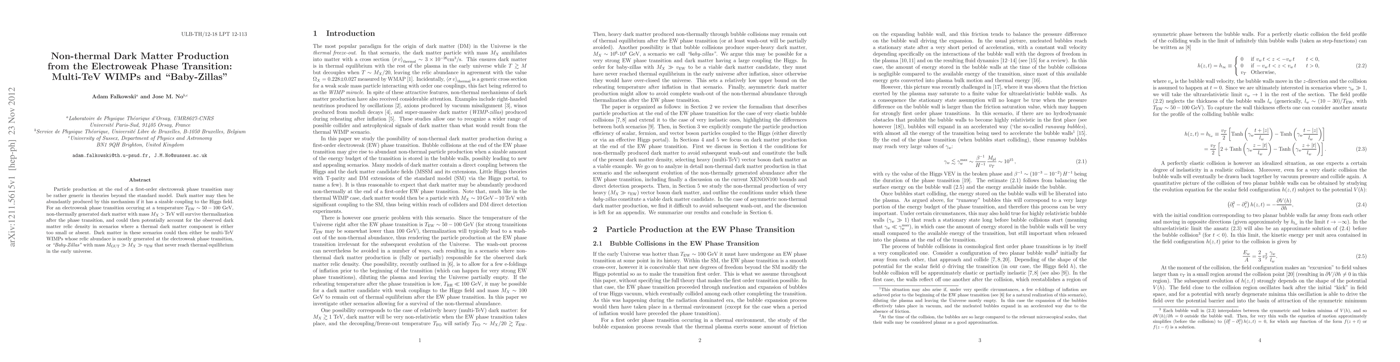 This paper explores non-thermal production of dark matter from a first-order electroweak phase transition, suggesting that multi-TeV WIMPs or "Baby-Zillas" could account for the observed dark matter relic density without thermal equilibrium. The mechanism is viable for a transition temperature of 50-100 GeV.