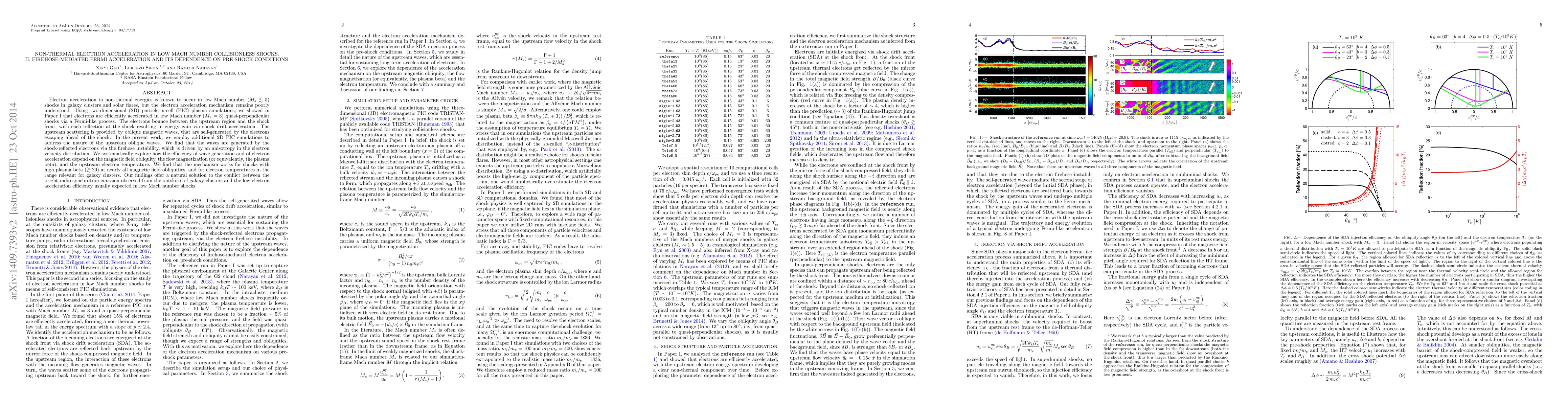 Electron acceleration to non-thermal energies is known to occur in low Mach number (M<5) shocks in galaxy clusters and solar flares, but the electron acceleration mechanism remains poorly understood. Using two-dimensional (2D) particle-in-cell (PIC) plasma simulations, we showed in Paper I that electrons are efficiently accelerated in low Mach number (M=3) quasi-perpendicular shocks via a Fermi-like process. The electrons bounce between the upstream region and the shock front, with each reflection at the shock resulting in energy gain via shock drift acceleration. The upstream scattering is provided by oblique magnetic waves, that are self-generated by the electrons escaping ahead of the shock. In the present work, we employ additional 2D PIC simulations to address the nature of the upstream oblique waves. We find that the waves are generated by the shock-reflected electrons via the firehose instability, which is driven by an anisotropy in the electron velocity distribution. We systematically explore how the efficiency of wave generation and of electron acceleration depend on the magnetic field obliquity, the flow magnetization (or equivalently, the plasma beta), and the upstream electron temperature. We find that the mechanism works for shocks with high plasma beta (>20) at nearly all magnetic field obliquities, and for electron temperatures in the range relevant for galaxy clusters. Our findings offer a natural solution to the conflict between the bright radio synchrotron emission observed from the outskirts of galaxy clusters and the low electron acceleration efficiency usually expected in low Mach number shocks.