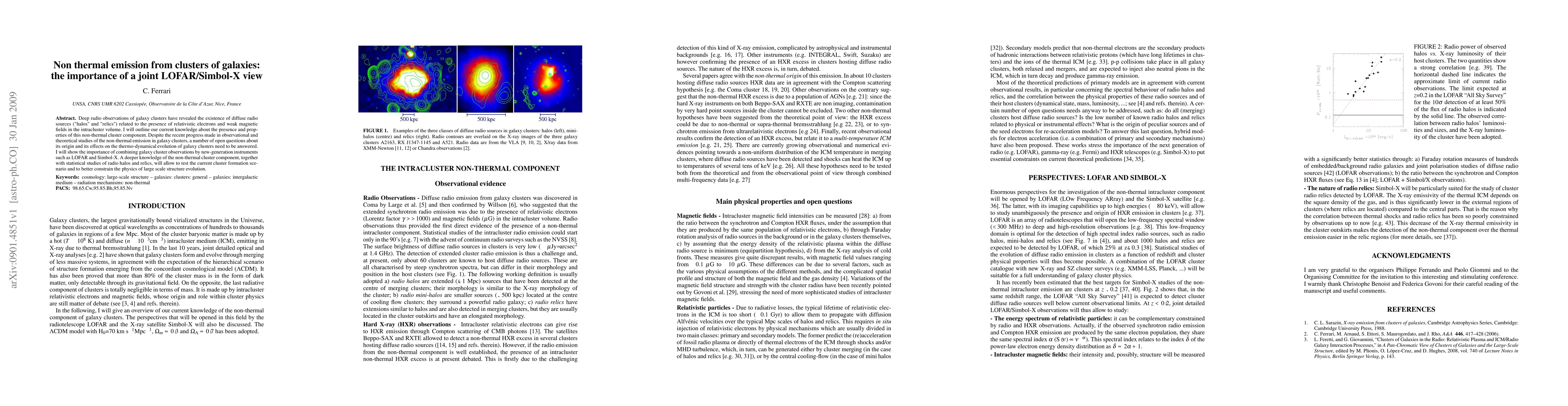 Deep radio observations of galaxy clusters have revealed the existence of diffuse radio sources ("halos" and "relics") related to the presence of relativistic electrons and weak magnetic fields in the intracluster volume. I will outline our current knowledge about the presence and properties of this non-thermal cluster component. Despite the recent progress made in observational and theoretical studies of the non-thermal emission in galaxy clusters, a number of open questions about its origin and its effects on the thermo-dynamical evolution of galaxy clusters need to be answered. I will show the importance of combining galaxy cluster observations by new-generation instruments such as LOFAR and Simbol-X. A deeper knowledge of the non-thermal cluster component, together with statistical studies of radio halos and relics, will allow to test the current cluster formation scenario and to better constrain the physics of large scale structure evolution.