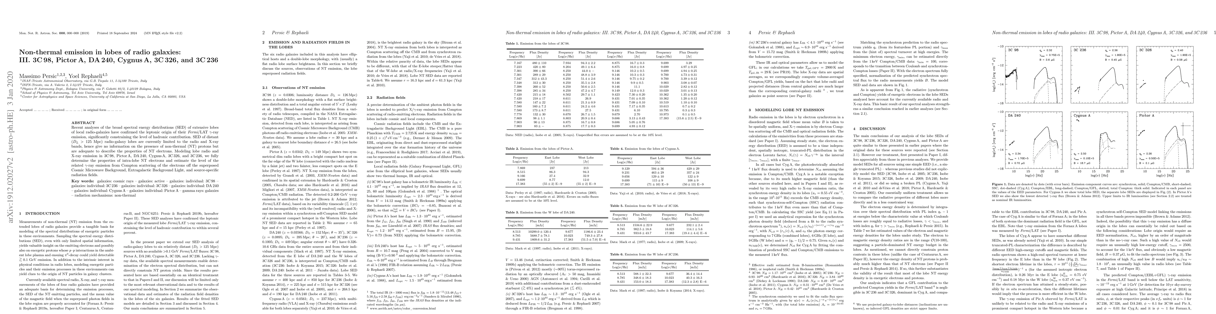 This paper analyzes the non-thermal emission in the lobes of several radio galaxies, confirming the leptonic origin of their gamma-ray emission and determining the properties of non-thermal electrons through modeling their radio and X-ray emissions. The study estimates the gamma-ray emission from electron-photon interactions.
