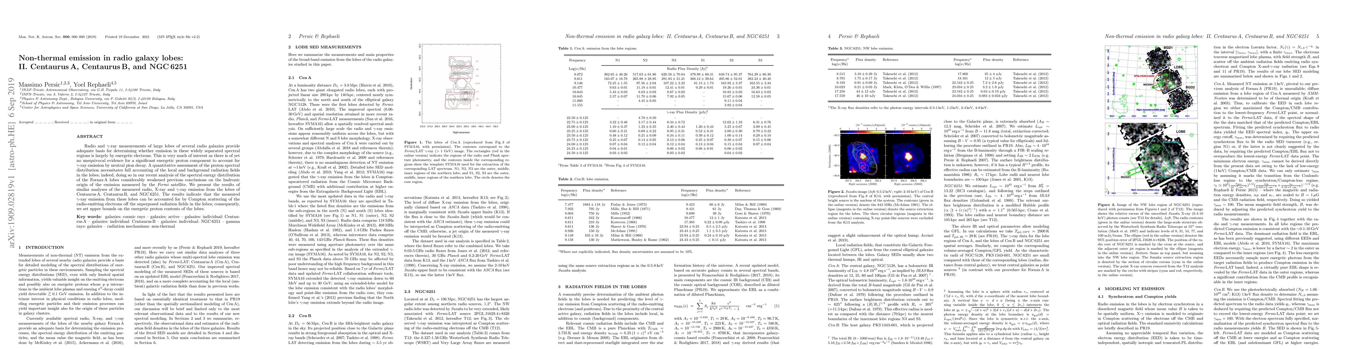 This paper investigates the non-thermal emission in the lobes of Centaurus A, Centaurus B, and NGC 6251, finding that $\gamma$-ray emission can be explained by electron Compton scattering rather than proton decay, thus setting upper limits on the energetic proton content.