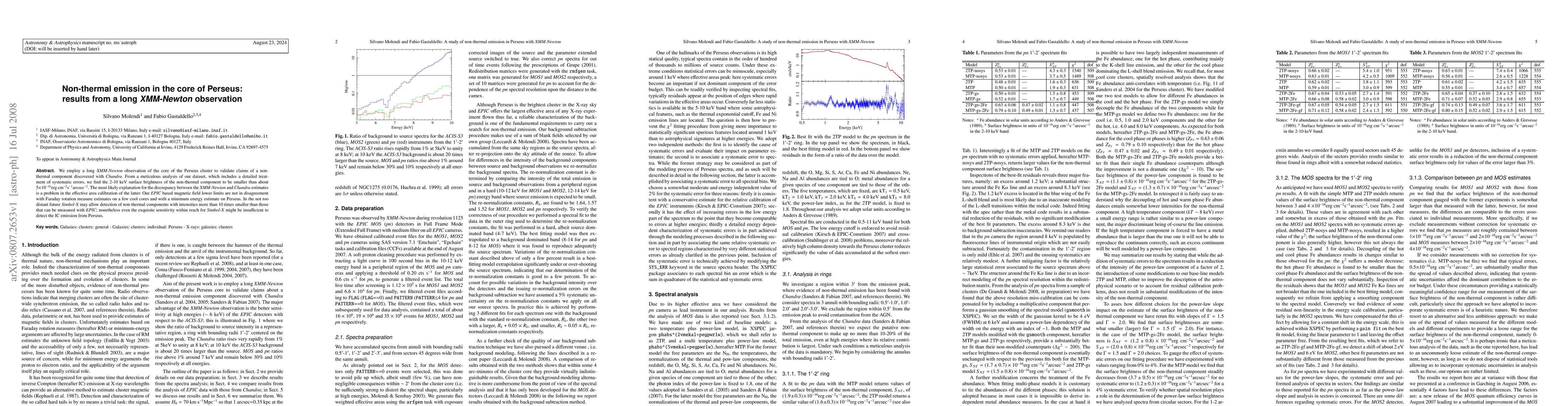 We employ a long XMM-Newton observation of the core of the Perseus cluster to validate claims of a non-thermal component discovered with Chandra. From a meticulous analysis of our dataset, which includes a detailed treatment of systematic errors, we find the 2-10 keV surface brightness of the non-thermal component to be smaller than about 5x10^-16 erg cm^-2s^-1arcsec^-2. The most likely explanation for the discrepancy between the XMM-Newton and Chandra estimates is a problem in the effective area calibration of the latter. Our EPIC based magnetic field lower limits are not in disagreement with Faraday rotation measure estimates on a few cool cores and with a minimum energy estimate on Perseus. In the not too distant future Simbol-X may allow detection of non-thermal components with intensities more than 10 times smaller than those that can be measured with EPIC; nonetheless even the exquisite sensitivity within reach for Simbol-X might be insufficient to detect the IC emission from Perseus.