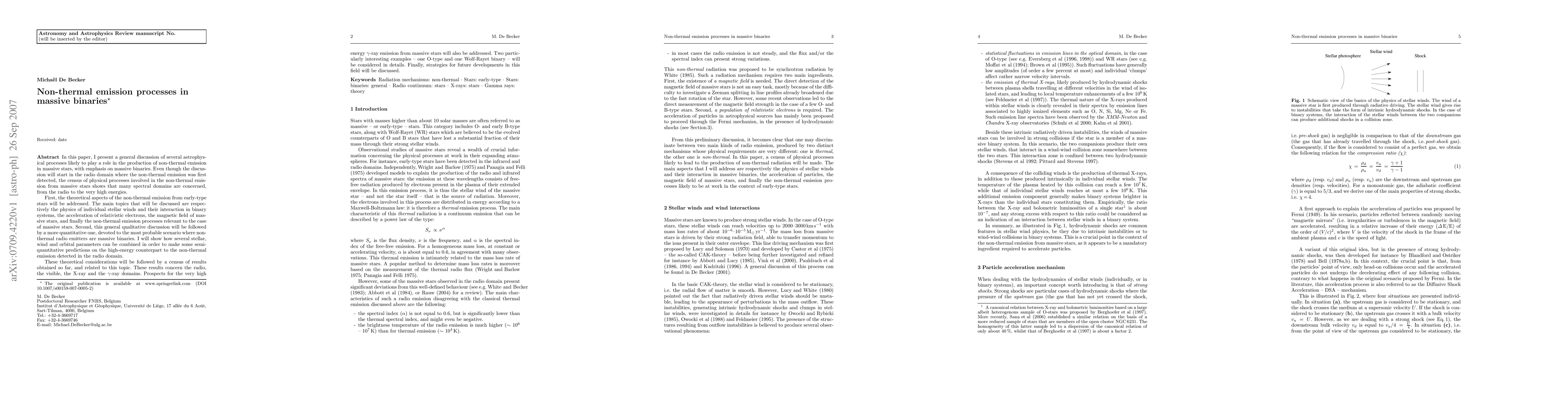 This paper explores astrophysical processes generating non-thermal emissions in massive stars, particularly in binary systems, spanning from radio to very high energies. It discusses theoretical aspects of stellar winds, relativistic electron acceleration, and magnetic fields, followed by a quantitative analysis of non-thermal radio emitters in massive binaries.