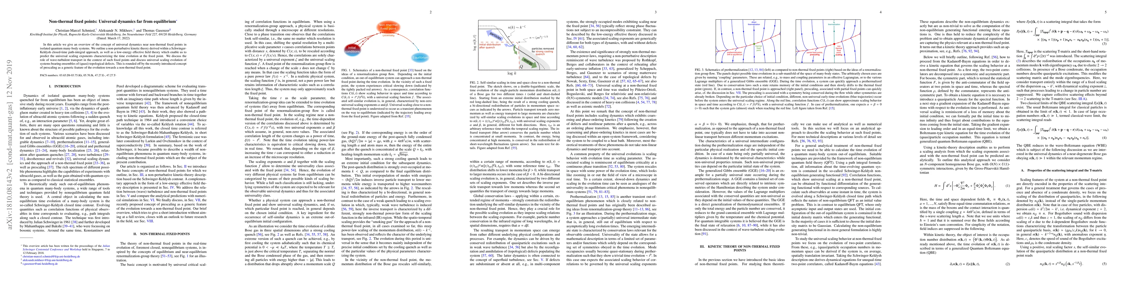 This paper explores universal dynamics in isolated quantum many-body systems near non-thermal fixed points, employing a non-perturbative kinetic theory and low-energy effective field theory to predict scaling exponents. It also examines wave-turbulent transport and the role of topological defects, introducing prescaling as a common feature in the evolution towards these fixed points.