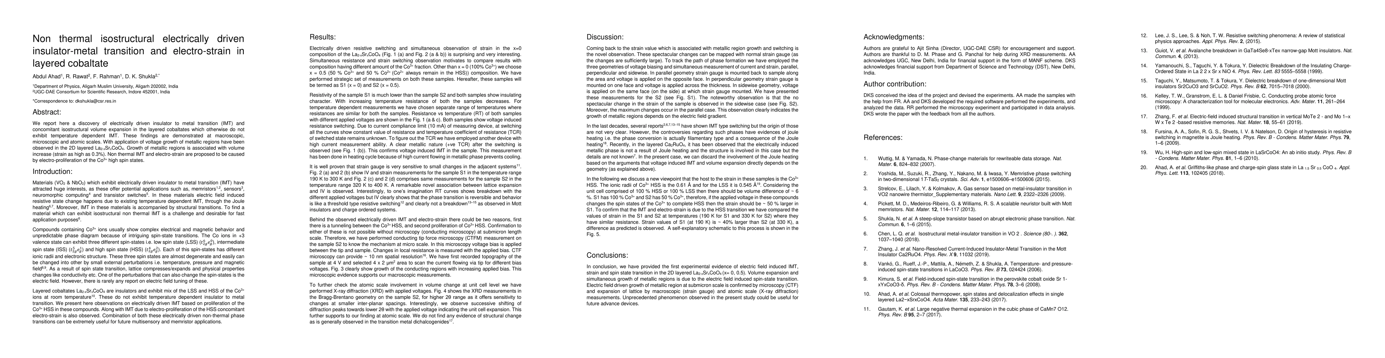 We report here a discovery of electrically driven insulator to metal transition (IMT) and concomitant isostructural volume expansion in the layered cobaltates which otherwise do not exhibit temperature dependent IMT. These findings are demonstrated at macroscopic, microscopic and atomic scales. With application of voltage growth of metallic regions have been observed in the 2D layered La2-xSrxCoO4. Growth of metallic regions is associated with volume increase (strain as high as 0.3%). Non thermal IMT and electro-strain are proposed to be caused by electro-proliferation of the Co3+ high spin states.