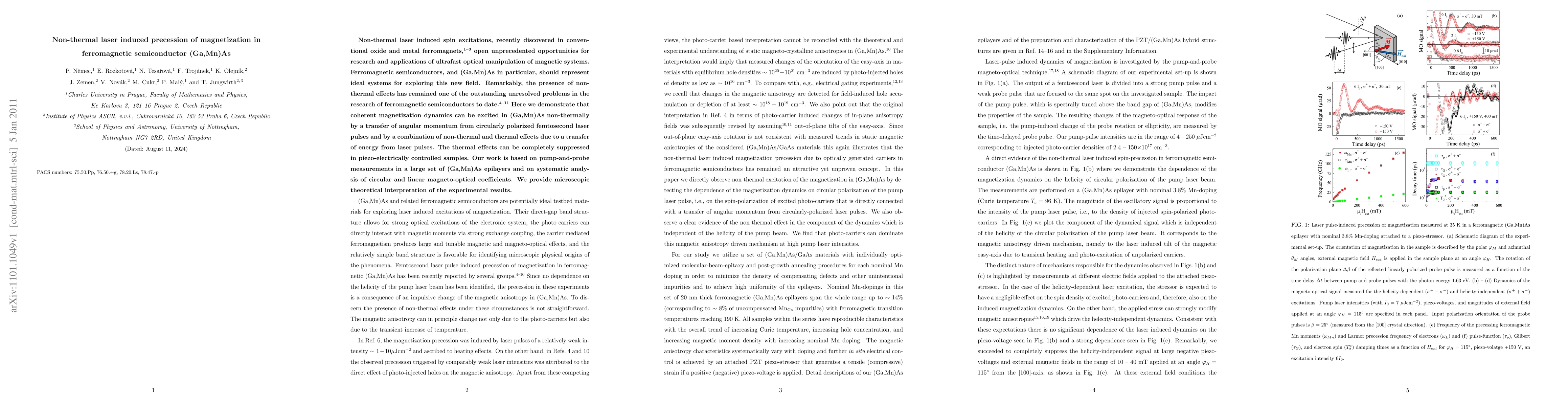 This paper demonstrates non-thermal laser-induced precession of magnetization in ferromagnetic semiconductor (Ga,Mn)As, utilizing circularly polarized femtosecond laser pulses to excite coherent magnetization dynamics without thermal effects. The study combines experimental pump-and-probe measurements with theoretical analysis to explore ultrafast optical manipulation of magnetic systems.