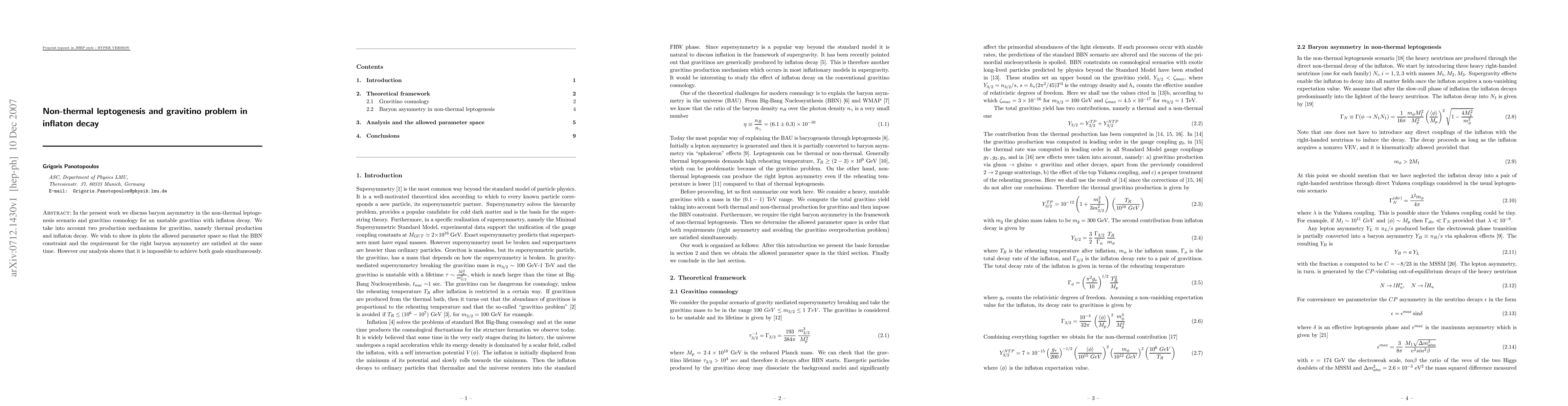 This paper explores non-thermal leptogenesis in the context of gravitino cosmology, focusing on the decay of inflaton to produce gravitinos. It finds that achieving both the correct baryon asymmetry and the Big Bang Nucleosynthesis (BBN) constraints simultaneously is impossible due to competing production mechanisms.