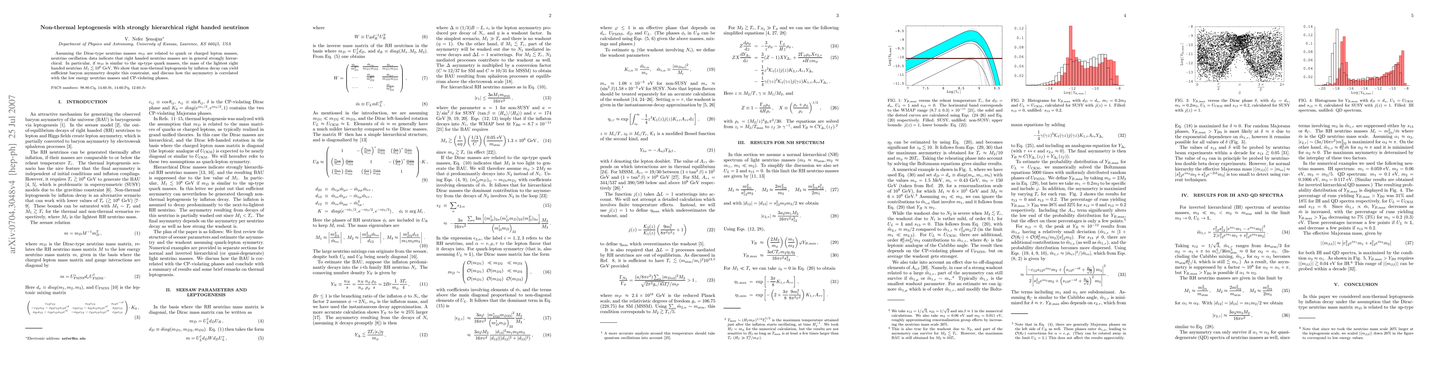 The paper presents a detailed analysis of non-thermal leptogenesis through inflaton decay, considering strongly hierarchical right-handed neutrino masses, and provides explicit expressions for lepton asymmetry and washout factors.