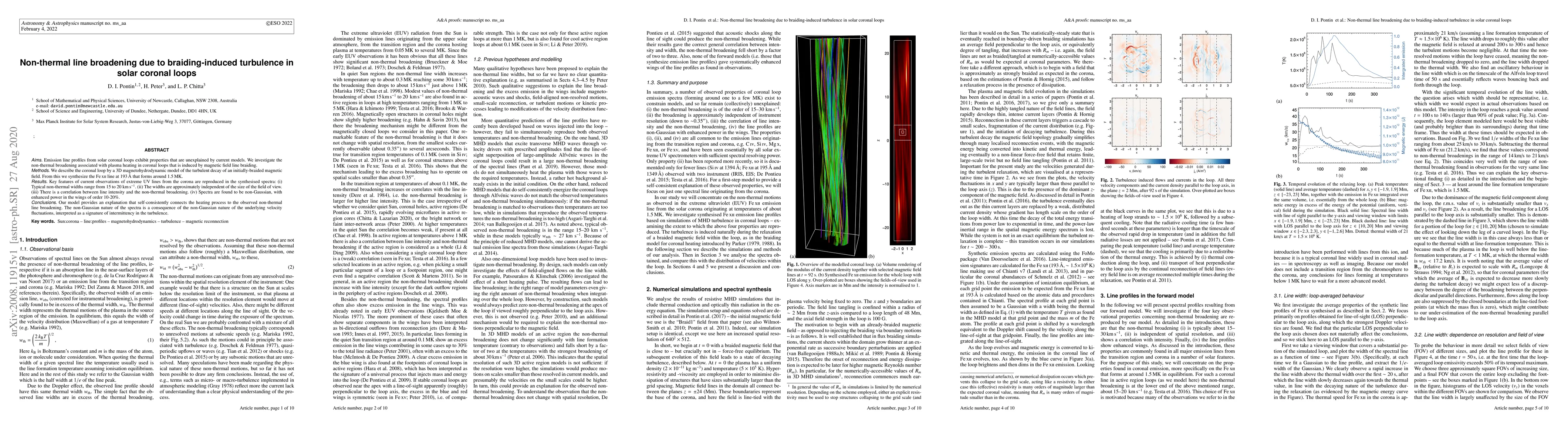 This study investigates non-thermal line broadening in solar coronal loops caused by magnetic field line braiding, using a 3D magnetohydrodynamic model. The model successfully reproduces observed extreme UV line features, including non-Gaussian spectra and correlations between line intensity and broadening, providing a self-consistent explanation for the heating-induced turbulence.