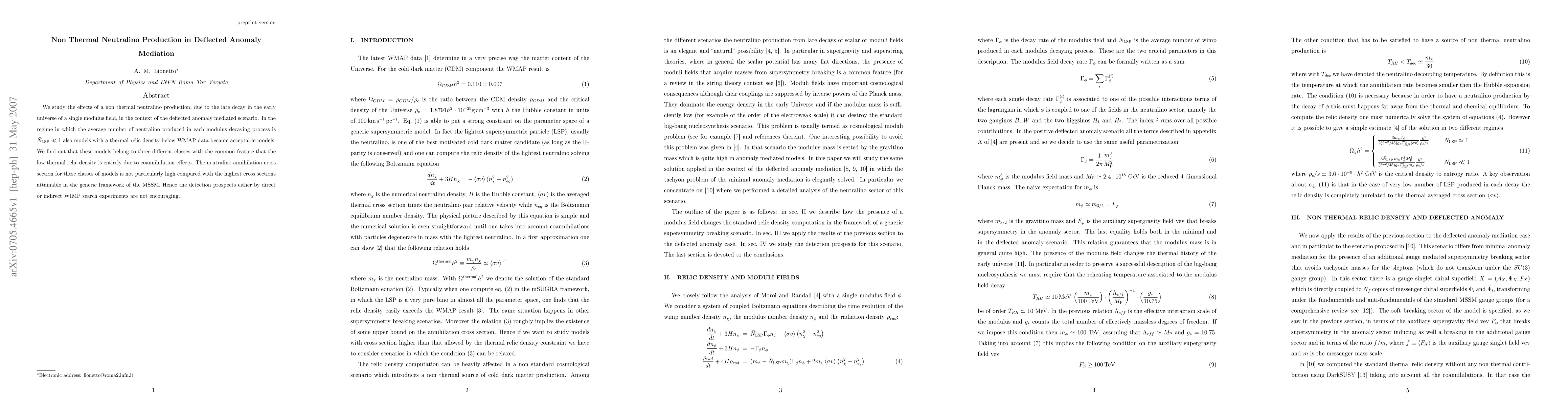 We study the effects of a non thermal neutralino production, due to the late decay in the early universe of a single modulus field, in the context of the deflected anomaly mediated scenario. In the regime in which the average number of neutralino produced in each modulus decaying process is $\bar{N}_{{\rm LSP}}\ll 1$ also models with a thermal relic density below WMAP data became acceptable models. We find out that these models belong to three different classes with the common feature that the low thermal relic density is entirely due to coannihilation effects. The neutralino annihilation cross section for these classes of models is not particularly high compared with the highest cross sections attainable in the generic framework of the MSSM. Hence the detection prospects either by direct or indirect WIMP search experiments are not encouraging.