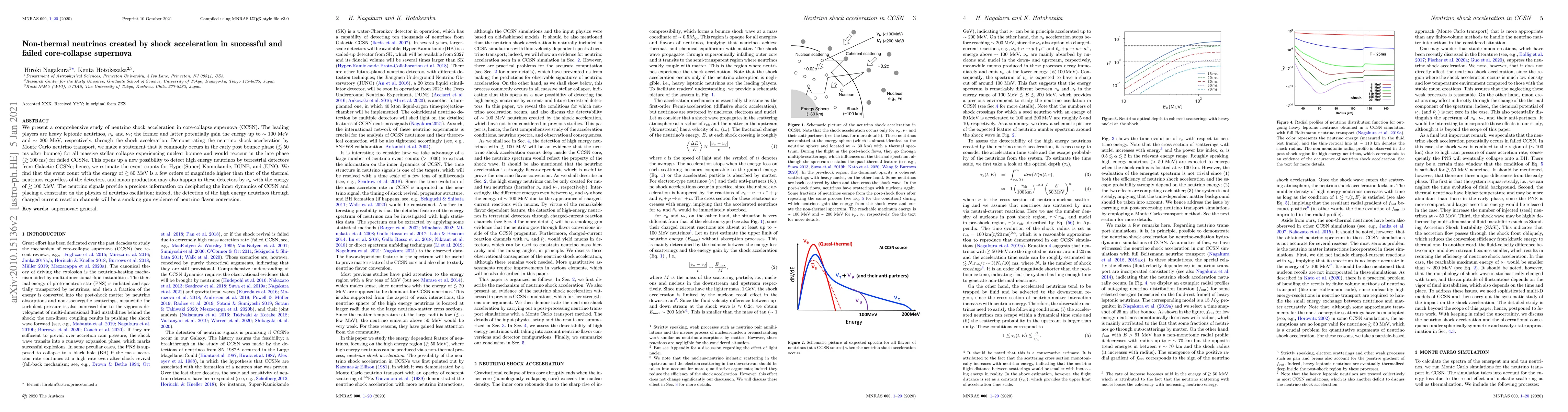 We present a comprehensive study of neutrino shock acceleration in core-collapse supernova (CCSN). The leading players are heavy leptonic neutrinos, $\nu_{\mu}$ and $\nu_{\tau}$; the former and latter potentially gain the energy up to $\sim 100$ MeV and $\sim 200$ MeV, respectively, through the shock acceleration. Demonstrating the neutrino shock acceleration by Monte Carlo neutrino transport, we make a statement that it commonly occurs in the early post bounce phase ($\lesssim 50$ ms after bounce) for all massive stellar collapse experiencing nuclear bounce and would reoccur in the late phase ($\gtrsim 100$ ms) for failed CCSNe. This opens up a new possibility to detect high energy neutrinos by terrestrial detectors from Galactic CCSNe; hence, we estimate the event counts for Hyper(Super)-Kamiokande, DUNE, and JUNO. We find that the event count with the energy of $\gtrsim 80$ MeV is a few orders of magnitude higher than that of the thermal neutrinos regardless of the detectors, and muon production may also happen in these detectors by $\nu_{\mu}$ with the energy of $\gtrsim 100$ MeV. The neutrino signals provide a precious information on deciphering the inner dynamics of CCSN and placing a constraint on the physics of neutrino oscillation; indeed, the detection of the high energy neutrinos through charged current reaction channels will be a smoking gun evidence of neutrino flavor conversion.