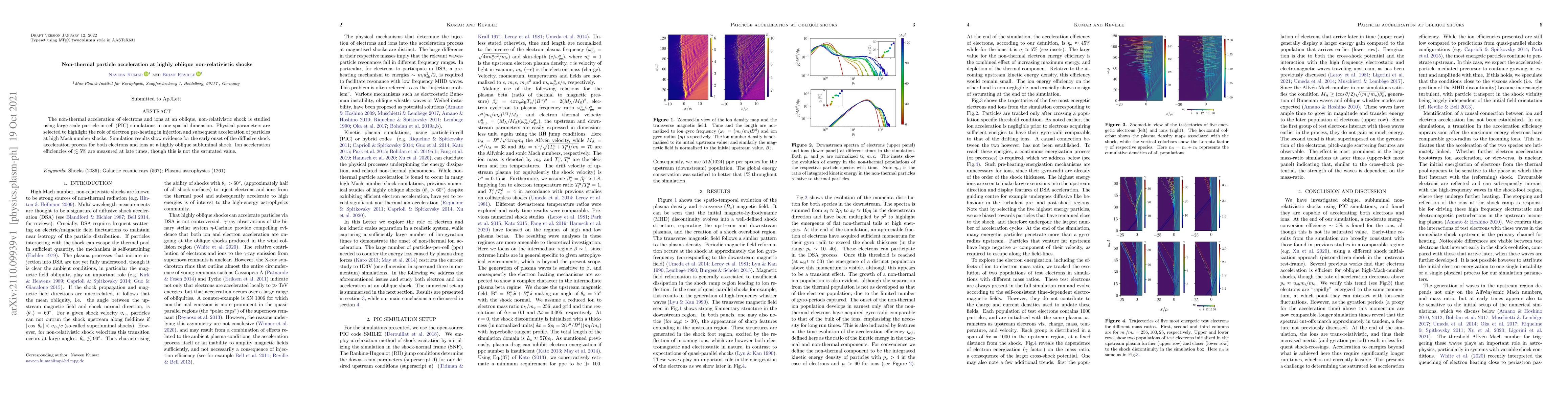 Summary: Large-scale PIC simulations reveal the non-thermal acceleration of electrons and ions at highly oblique, non-relativistic shocks, emphasizing the role of electron pre-heating. The simulations show early onset of diffusive shock acceleration, with ion acceleration efficiencies of around 5% at late times.