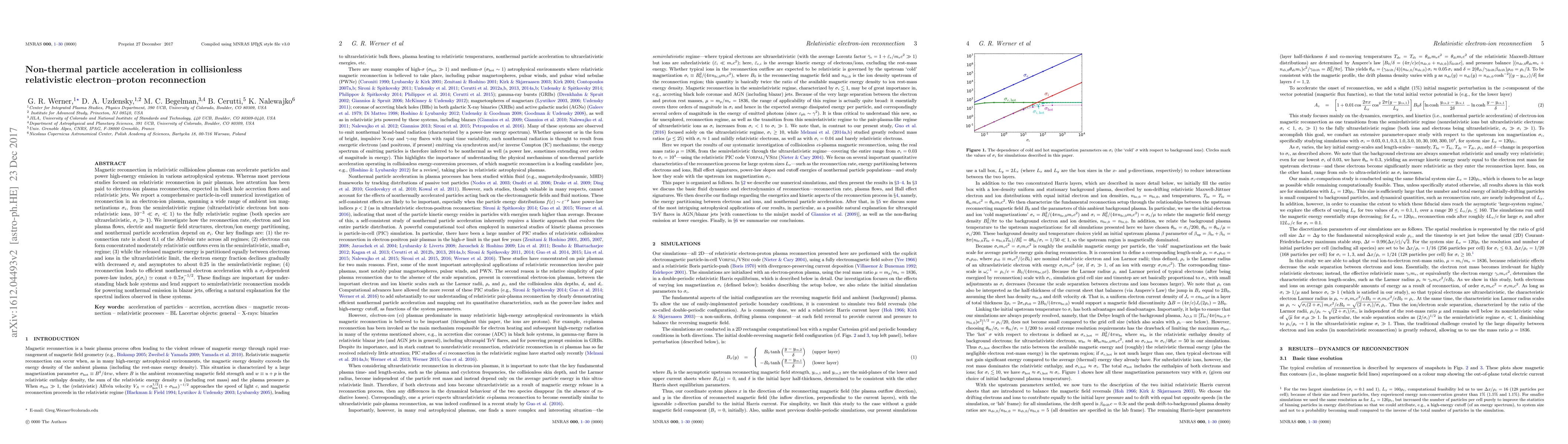 This study investigates non-thermal particle acceleration in relativistic electron-proton reconnection, revealing that the reconnection rate remains constant at 0.1 of the Alfvenic rate across various regimes. It finds that electrons can achieve moderate relativistic speeds even in semirelativistic conditions, and that the energy partitioning between electrons and ions depends on the ion magnetization, supporting semirelativistic reconnection models for blazar jets.