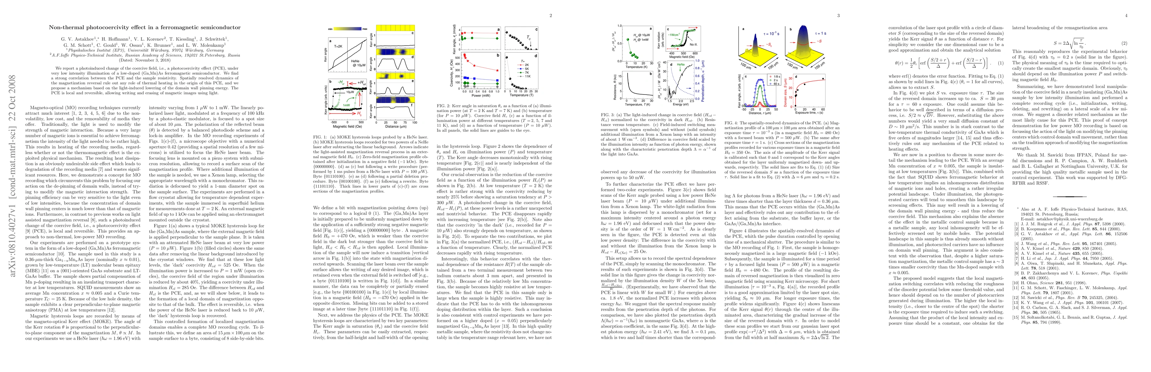 This paper reports a photocoercivity effect in low-doped (Ga,Mn)As, where low-intensity light induces a change in the coercive field without thermal heating, suggesting a mechanism based on light-induced domain wall pinning energy reduction. The effect is local and reversible, enabling light-based magnetic image writing and erasing.