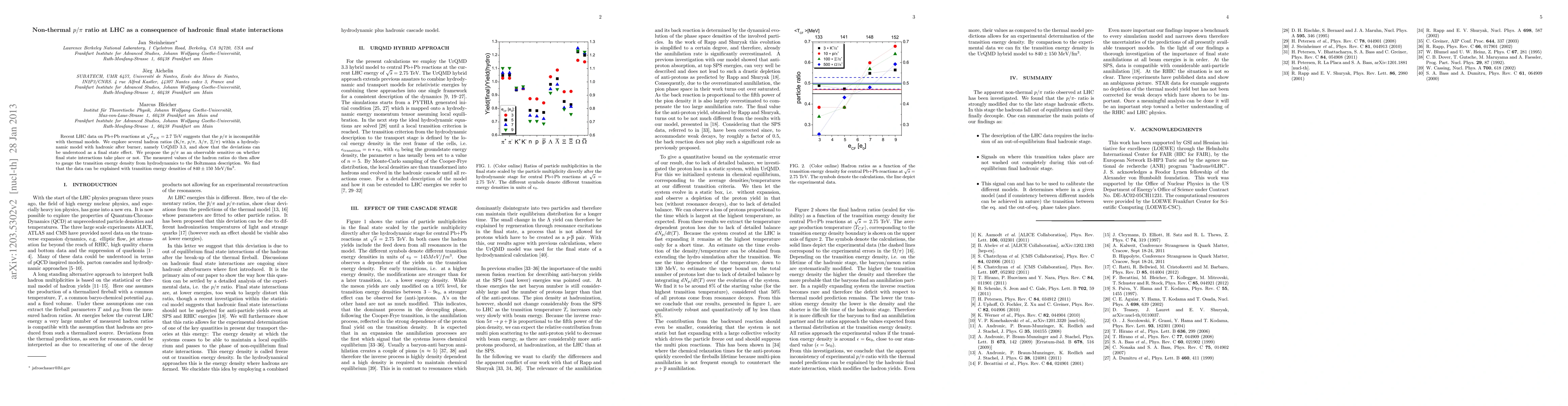 Recent LHC data on Pb+Pb reactions at sqrt(s_{NN})=2.7 TeV suggests that the p/pi is incompatible with thermal models. We explore several hadron ratios (K/pi, p/pi, Lambda/pi, Xi/pi) within a hydrodynamic model with hadronic after burner, namely UrQMD 3.3, and show that the deviations can be understood as a final state effect. We propose the p/pi as an observable sensitive on whether final state interactions take place or not. The measured values of the hadron ratios do then allow to gauge the transition energy density from hydrodynamics to the Boltzmann description. We find that the data can be explained with transition energy densities of 840 +- 150 MeV/fm^3.
