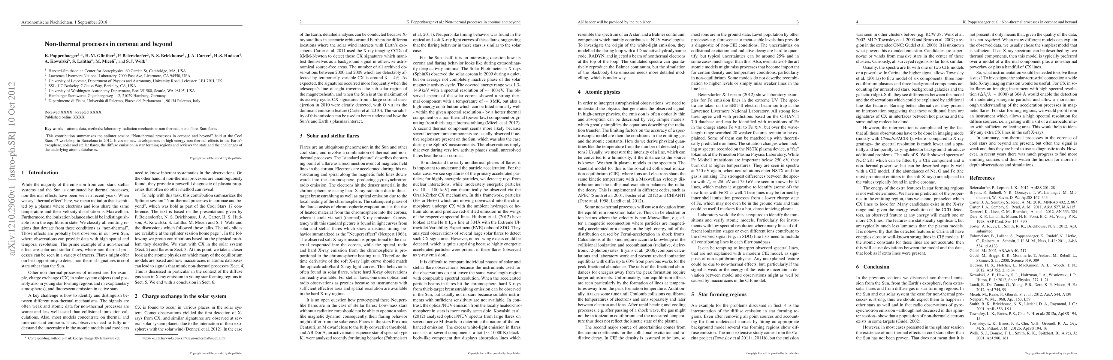This contribution summarizes the splinter session "Non-thermal processes in coronae and beyond" held at the Cool Stars 17 workshop in Barcelona in 2012. It covers new developments in high energy non-thermal effects in the Earth's exosphere, solar and stellar flares, the diffuse emission in star forming regions and reviews the state and the challenges of the underlying atomic databases.