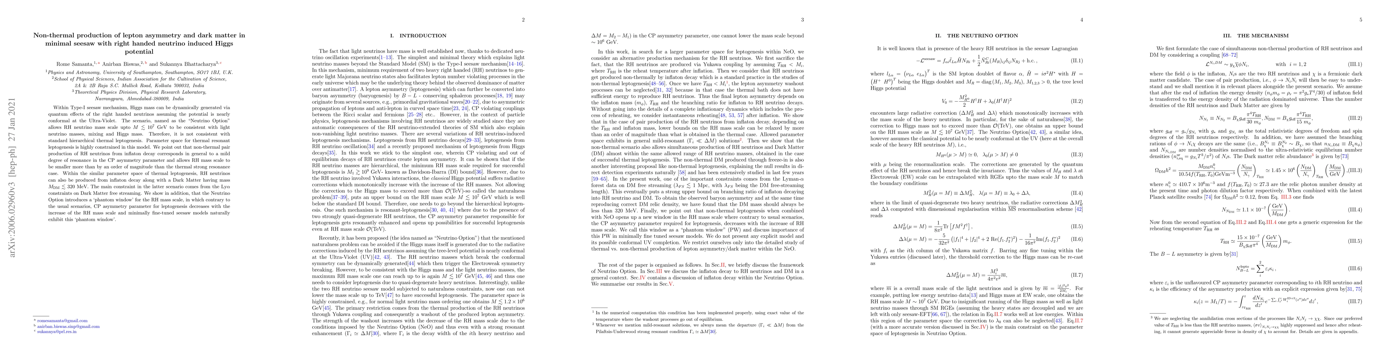 This paper explores the "Neutrino Option" in the Type-I seesaw mechanism, where right-handed neutrinos induce a nearly conformal Higgs potential, allowing for a lower mass scale consistent with observed neutrino masses and mixing. It proposes non-thermal production of right-handed neutrinos from inflaton decay, which can generate lepton asymmetry and produce dark matter with a mass up to 320 MeV, while introducing a 'phantom window' where the CP asymmetry decreases with increasing RH mass.
