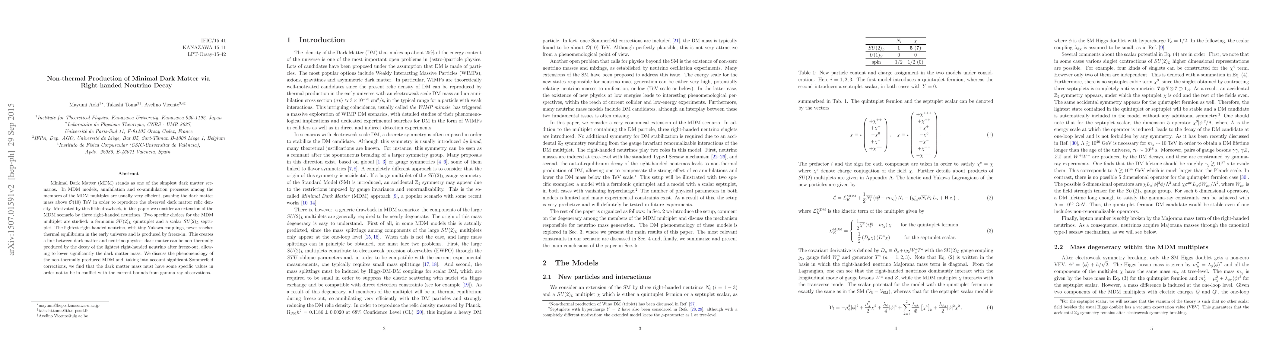 This paper explores minimal dark matter (MDM) production via the decay of non-thermally produced right-handed neutrinos, proposing a scenario where dark matter mass is significantly lowered. The study examines two MDM multiplets and finds specific dark matter mass values to avoid conflict with gamma-ray observations.