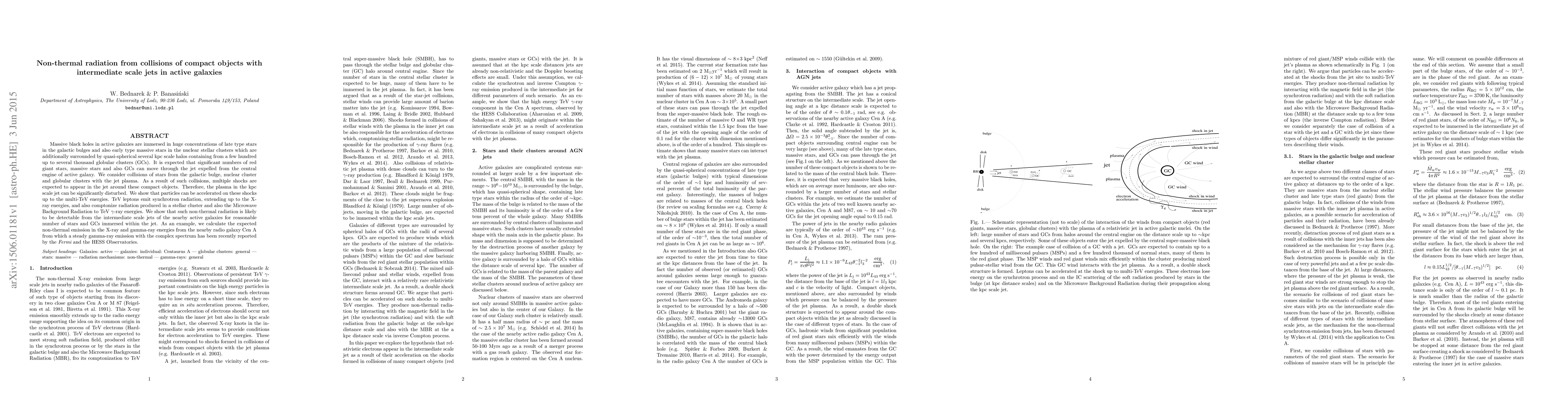Massive black holes in active galaxies are immersed in huge concentrations of late type stars in the galactic bulges and also early type massive stars in the nuclear stellar clusters which are additionally surrounded by quasi-spherical several kpc scale halos containing from a few hundred up to several thousand globular clusters (GCs). It is expected that significant numbers of red giant stars, massive stars and also GCs can move through the jet expelled from the central engine of active galaxy. We consider collisions of stars from the galactic bulge, nuclear cluster and globular clusters with the jet plasma. As a result of such collisions, multiple shocks are expected to appear in the jet around these compact objects. Therefore, the plasma in the kpc scale jet can be significantly disturbed. We show that particles can be accelerated on these shocks up to the multi-TeV energies. TeV leptons emit synchrotron radiation, extending up to the X-ray energies, and also comptonize radiation produced in a stellar cluster and also the Microwave Background Radiation to TeV $\gamma$-ray energies. We show that such non-thermal radiation is likely to be detectable from the intermediate scale jets of the nearby active galaxies for reasonable number of stars and GCs immersed within the jet. As an example, we calculate the expected non-thermal emission in the X-ray and gamma-ray energies from the nearby radio galaxy Cen A from which a steady gamma-ray emission with the complex spectrum has been recently reported by the Fermi and the HESS Observatories.