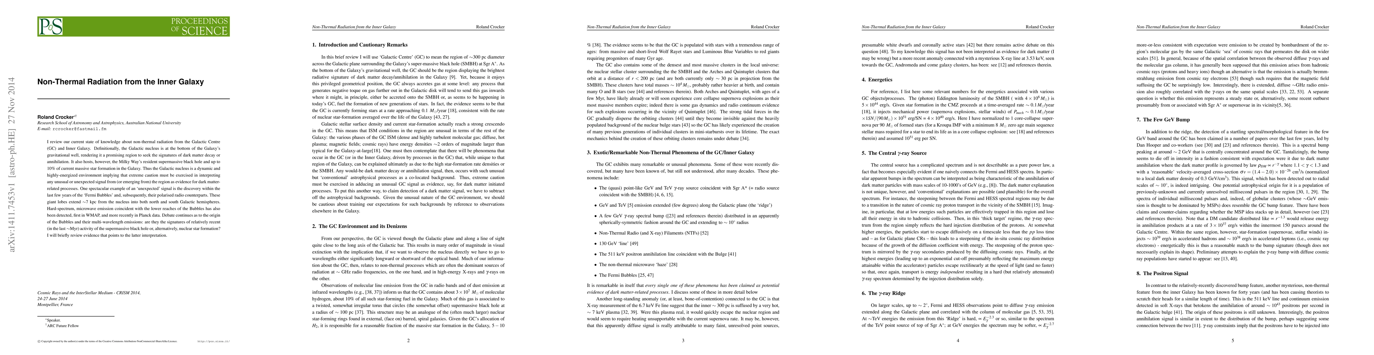 I review our current state of knowledge about non-thermal radiation from the Galactic Centre (GC) and Inner Galaxy. Definitionally, the Galactic nucleus is at the bottom of the Galaxy's gravitational well, rendering it a promising region to seek the signatures of dark matter decay or annihilation. It also hosts, however, the Milky Way's resident supermassive black hole and up to 10% of current massive star formation in the Galaxy. Thus the Galactic nucleus is a dynamic and highly-energized environment implying that extreme caution must be exercised in interpreting any unusual or unexpected signal from (or emerging from) the region as evidence for dark matter-related processes. One spectacular example of an `unexpected' signal is the discovery within the last few years of the `Fermi Bubbles' and, subsequently, their polarised radio counterparts. These giant lobes extend ~7 kpc from the nucleus into both north and south Galactic hemispheres. Hard-spectrum, microwave emission coincident with the lower reaches of the Bubbles has also been detected, first in WMAP, and more recently in Planck data. Debate continues as to the origin of the Bubbles and their multi-wavelength emissions: are they the signatures of relatively recent (in the last ~Myr) activity of the supermassive black hole or, alternatively, nuclear star formation? I will briefly review evidence that points to the latter interpretation.