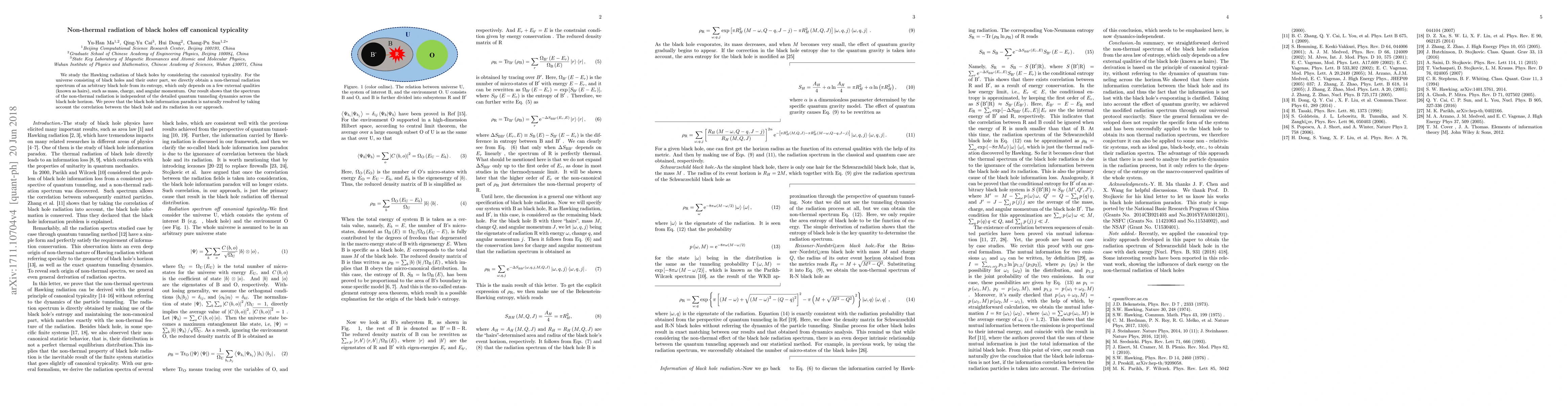 We study the Hawking radiation of black holes by considering the canonical typicality. For the universe consisting of black holes and their outer part, we directly obtain a non-thermal radiation spectrum of an arbitrary black hole from its entropy, which only depends on a few external qualities (known as hairs), such as mass, charge, and angular momentum. Our result shows that the spectrum of the non-thermal radiation is independent of the detailed quantum tunneling dynamics across black hole horizon. We prove that the black hole information paradox is naturally resolved by taking account the correlation between black hole and its radiation in our approach.