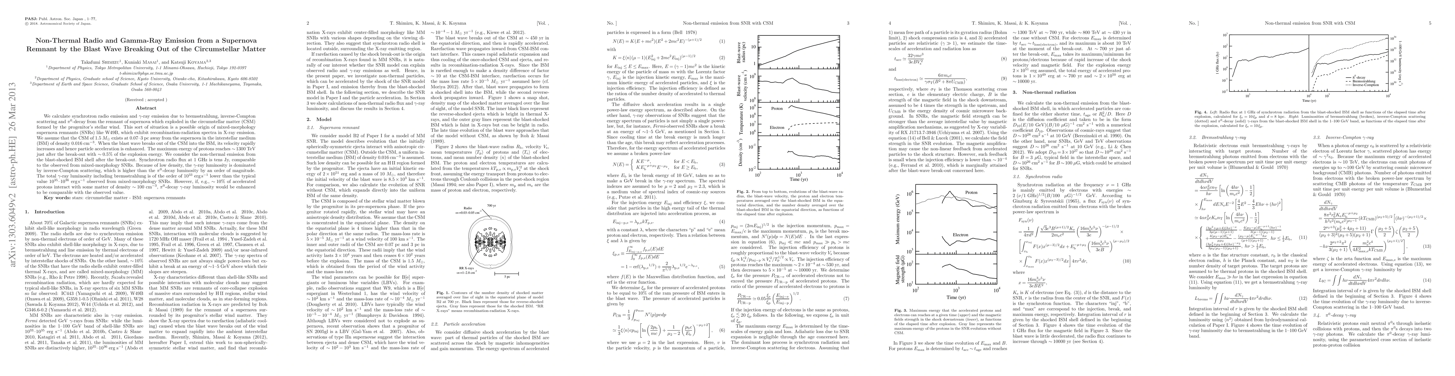 We calculate synchrotron radio emission and gamma-ray emission due to bremsstrahlung, inverse-Compton scattering and $pi^0$-decay from the remnant of supernova which exploded in the circumstellar matter (CSM) formed by the progenitor's stellar wind. This sort of situation is a possible origin of mixed-morphology supernova remnants (SNRs) like W49B, which exhibit recombination-radiation spectra in X-ray emission. We assume that the CSM of 1.5 $M_{odot}$ exists at 0.07--3 pc away from the supernova in the interstellar medium (ISM) of density 0.016 cm$^{-3}$. When the blast wave breaks out of the CSM into the ISM, its velocity rapidly increases and hence particle acceleration is enhanced. The maximum energy of protons reaches $sim$ 1300 TeV just after the break-out with $sim$ 0.5% of the explosion energy. We consider the non-thermal emission from the blast-shocked ISM shell after the break-out. Synchrotron radio flux at 1 GHz is tens Jy, comparable to the observed from mixed-morphology SNRs. Because of low density, the gamma-ray luminosity is dominated by inverse-Compton scattering, which is higher than the $pi^0$-decay luminosity by an order of magnitude. The total gamma-ray luminosity including bremsstrahlung is of the order of $10^{33}$ erg s$^{-1}$ lower than the typical value $10^{35}$--$10^{36}$ erg s$^{-1}$ observed from mixed-morphology SNRs. However, if, e.g., $sim$10% of accelerated protons interact with some matter of density $sim$100 cm$^{-3}$, $pi^0$-decay gamma-ray luminosity would be enhanced to be comparable with the observed value.