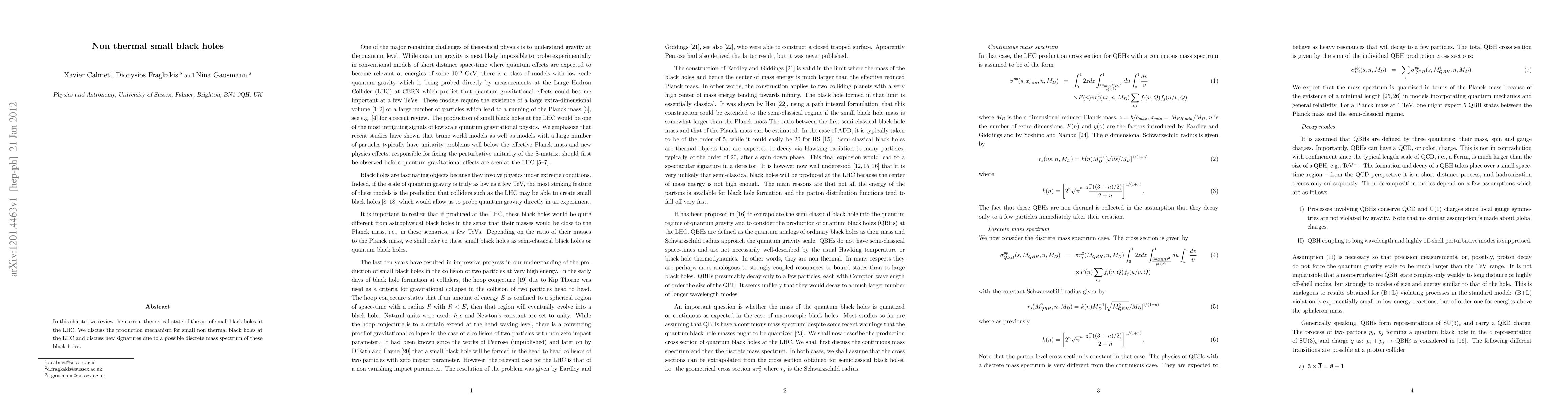 Summary: This paper reviews the theoretical framework for non-thermal small black holes produced at the LHC, focusing on their production mechanisms and exploring novel signatures arising from a potential discrete mass spectrum.