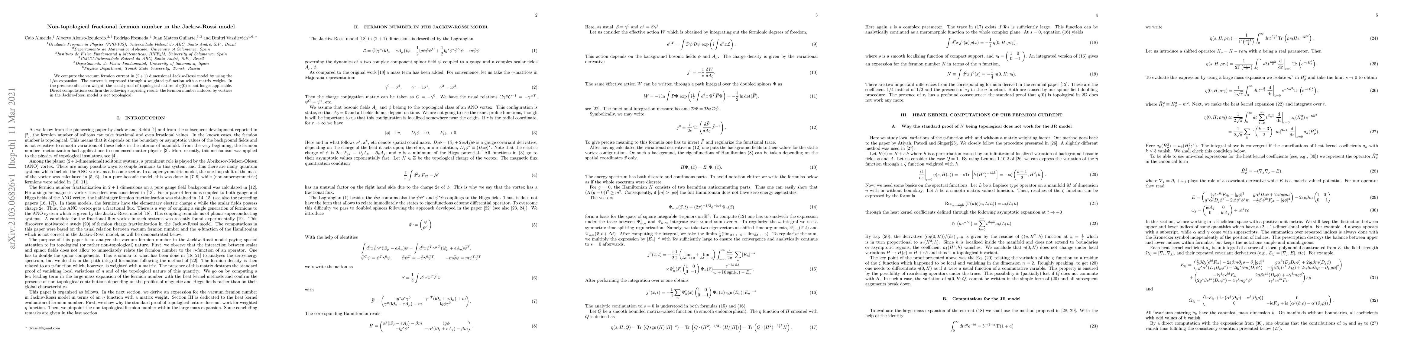 We compute the vacuum fermion current in $(2+1)$ dimensional Jackiw-Rossi model by using the $1/m$ expansion. The current is expressed through a weighted $\eta$-function with a matrix weight. In the presence of such a weight, the usual proof of topological nature of $\eta(0)$ is not longer applicable. Direct computations confirm the following surprising result: the fermion number induced by vortices in the Jackiw-Rossi model is \textit{not} topological.