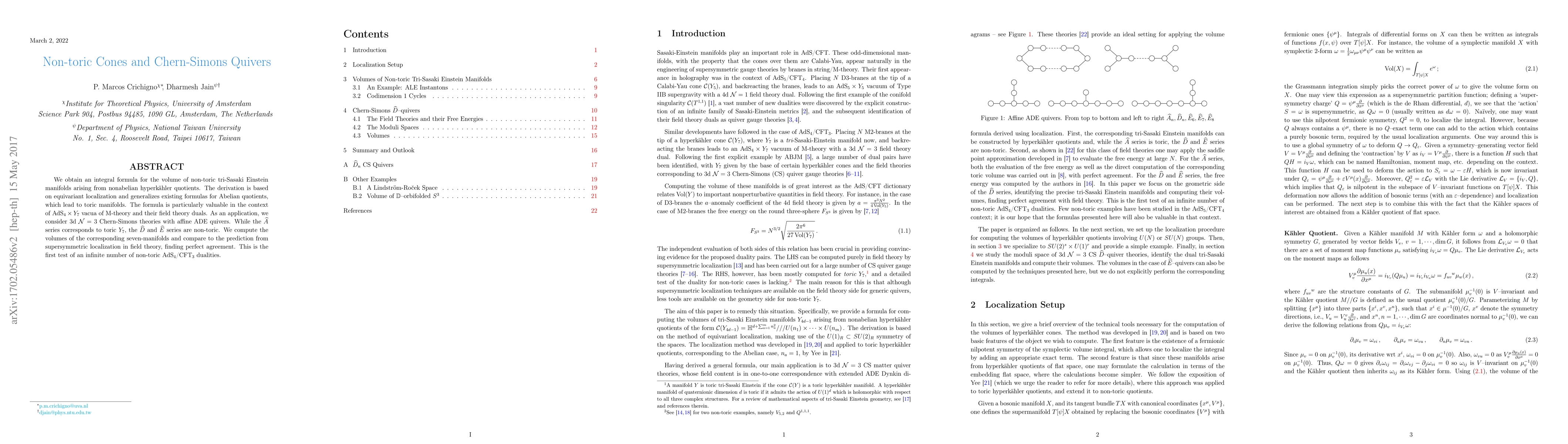 We obtain an integral formula for the volume of non-toric tri-Sasaki Einstein manifolds arising from nonabelian hyperkahler quotients. The derivation is based on equivariant localization and generalizes existing formulas for Abelian quotients, which lead to toric manifolds. The formula is particularly valuable in the context of AdS$_{4}\times Y_{7}$ vacua of M-theory and their field theory duals. As an application, we consider 3d $\mathcal N=3$ Chern-Simons theories with affine ADE quivers. While the $\widehat A$ series corresponds to toric $Y_{7}$, the $\widehat D$ and $\widehat E$ series are non-toric. We compute the volumes of the corresponding seven-manifolds and compare to the prediction from supersymmetric localization in field theory, finding perfect agreement. This is the first test of an infinite number of non-toric AdS$_4$/CFT$_3$ dualities.