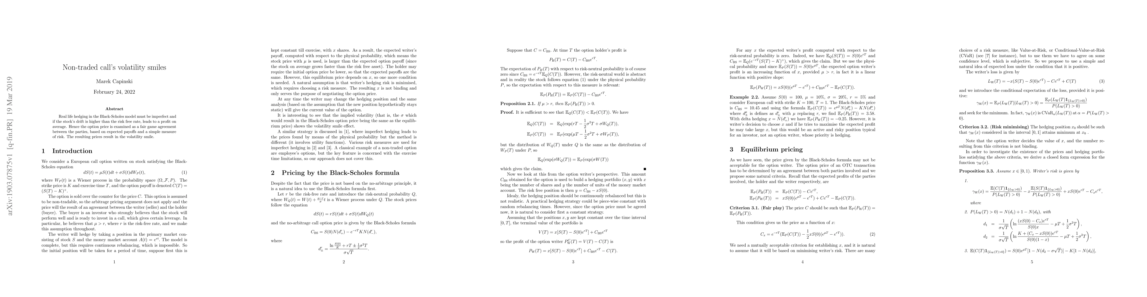 Real life hedging in the Black-Scholes model must be imperfect and if the stock's drift is higher than the risk free rate, leads to a profit on average. Hence the option price is examined as a fair game agreement between the parties, based on expected payoffs and a simple measure of risk. The resulting prices result in the volatility smile.