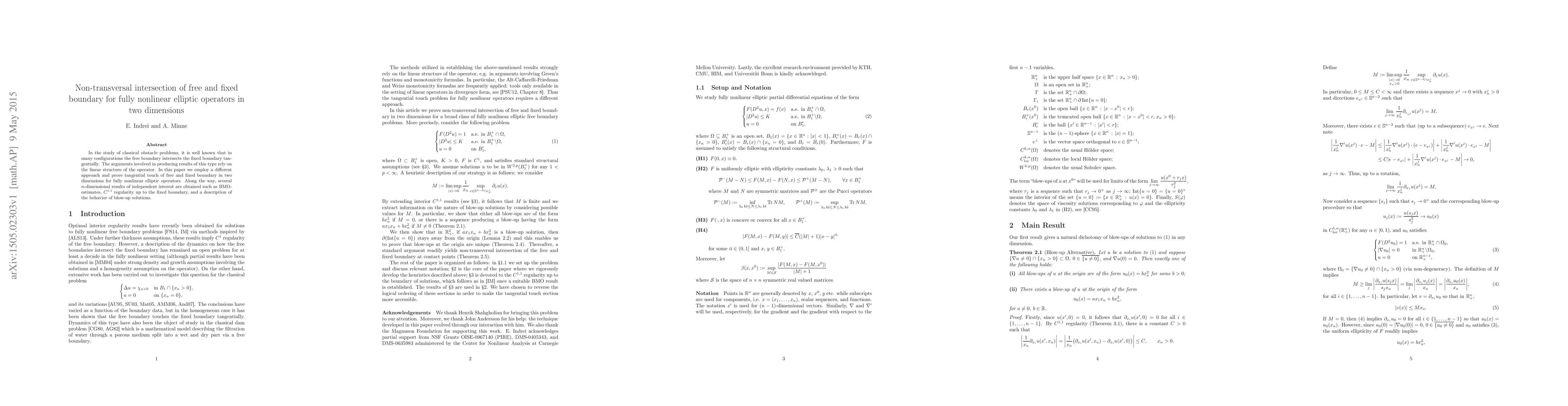Researchers prove that free boundaries of fully nonlinear elliptic operators in two dimensions intersect with fixed boundaries tangentially, a result not previously proven for linear operators. This work has implications for the study of obstacle problems and yields new estimates and regularity results.
