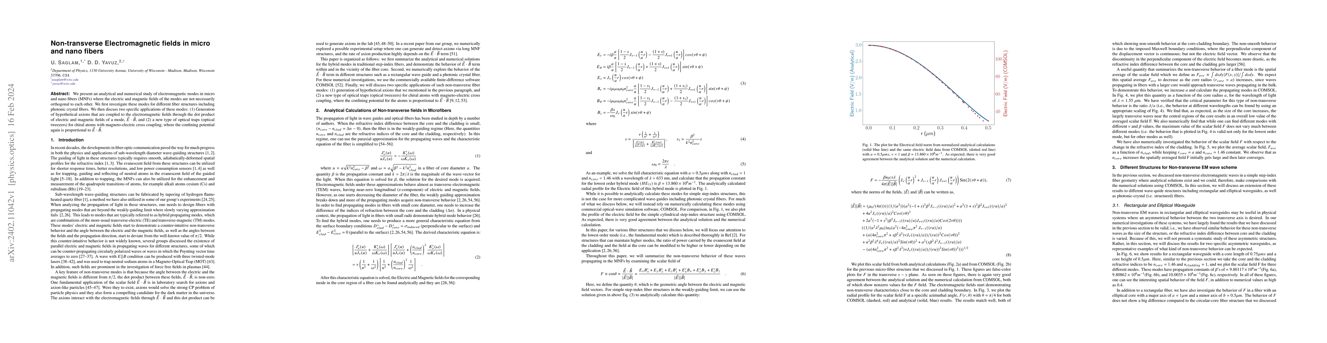 This study investigates electromagnetic modes in micro and nano fibers where electric and magnetic fields are not orthogonal, analyzing their applications in generating hypothetical axions via field dot products and developing optical traps for chiral atoms based on magneto-electric coupling.