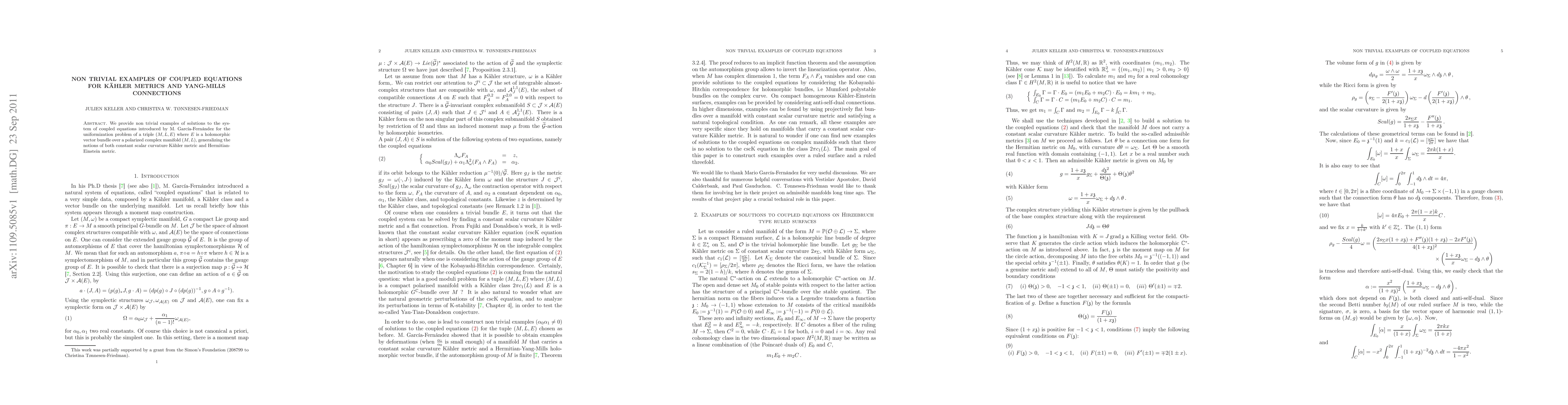 Researchers provide non-trivial examples of solutions to a system of coupled equations for K"ahler metrics and Yang-Mills connections, addressing the uniformization problem of a triple involving a complex manifold, holomorphic vector bundle, and polarized metric.