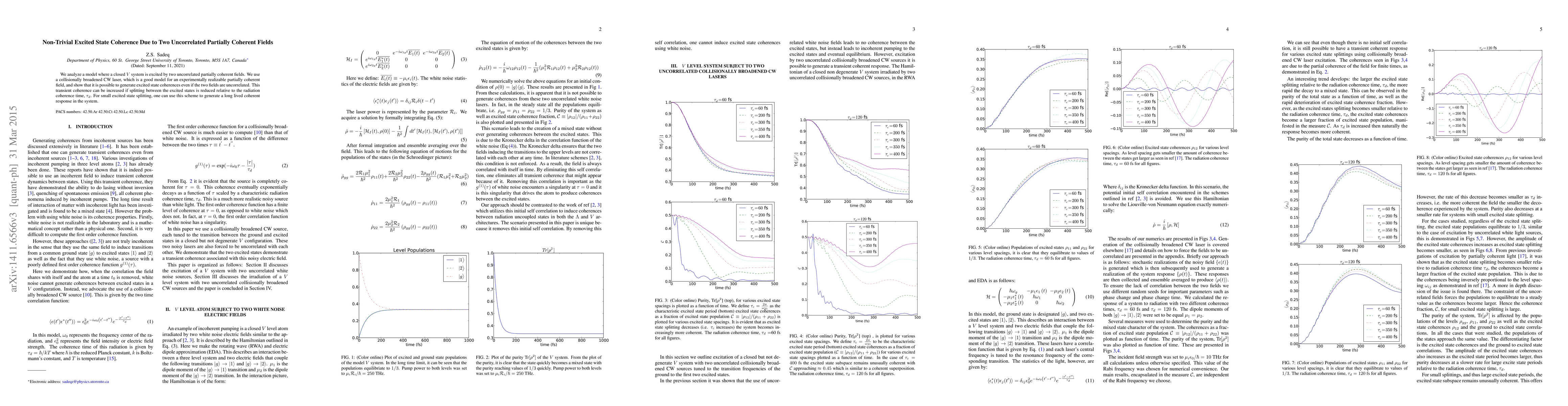 We analyze a model where a closed $V$ system is excited by two uncorrelated partially coherent fields. We use a collisionally broadened CW laser, which is a good model for an experimentally realizable partially coherent field, and show that it is possible to generate excited state coherences even if the two fields are uncorrelated. This transient coherence can be increased if splitting between the excited states is reduced relative to the radiation coherence time, $\tau_{d}$. For small excited state splitting, one can use this scheme to generate a long lived coherent response in the system.