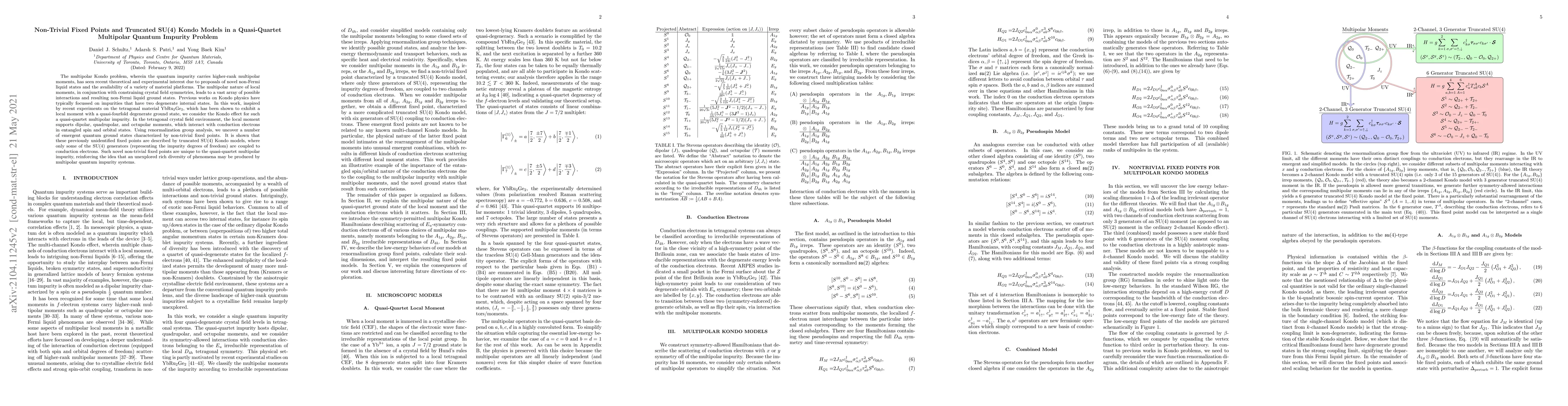 This paper investigates the Kondo effect in a quasi-quartet multipolar quantum impurity system, revealing novel non-trivial fixed points and emergent quantum ground states. Using renormalization group analysis, it identifies truncated SU(4) Kondo models that describe interactions between conduction electrons and specific multipolar moments in a tetragonal crystal field environment.