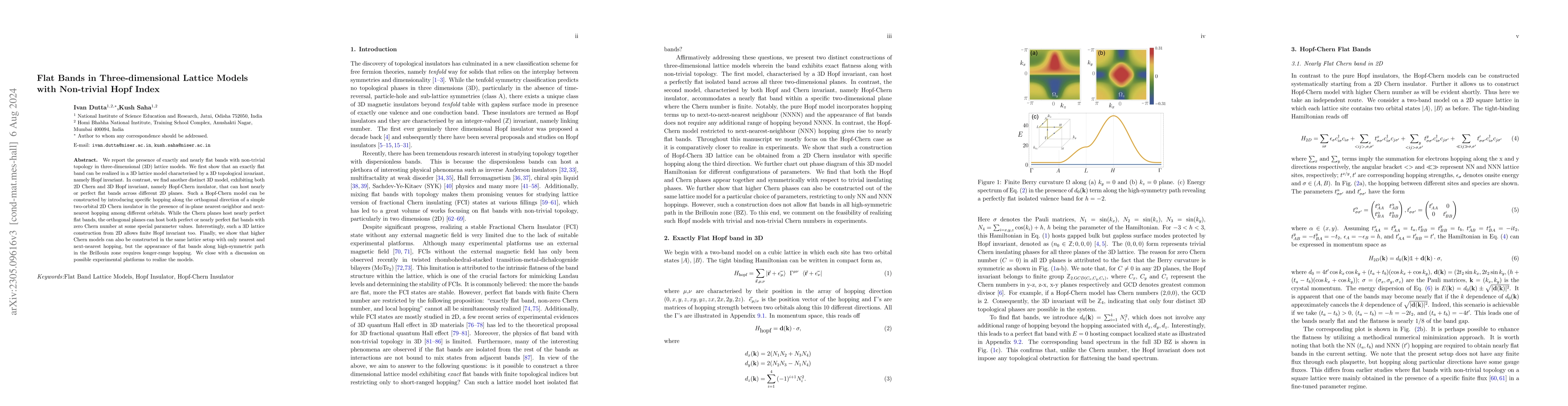 This paper reports the existence of non-trivial flat bands in a three-dimensional lattice model, demonstrating the realization of a genuine three-dimensional topological insulator phase through tuning hopping parameters. The study highlights the presence of both perfect and nearly perfect flat bands, along with additional topological invariants like Hopf invariant, and discusses potential experimental realizations.