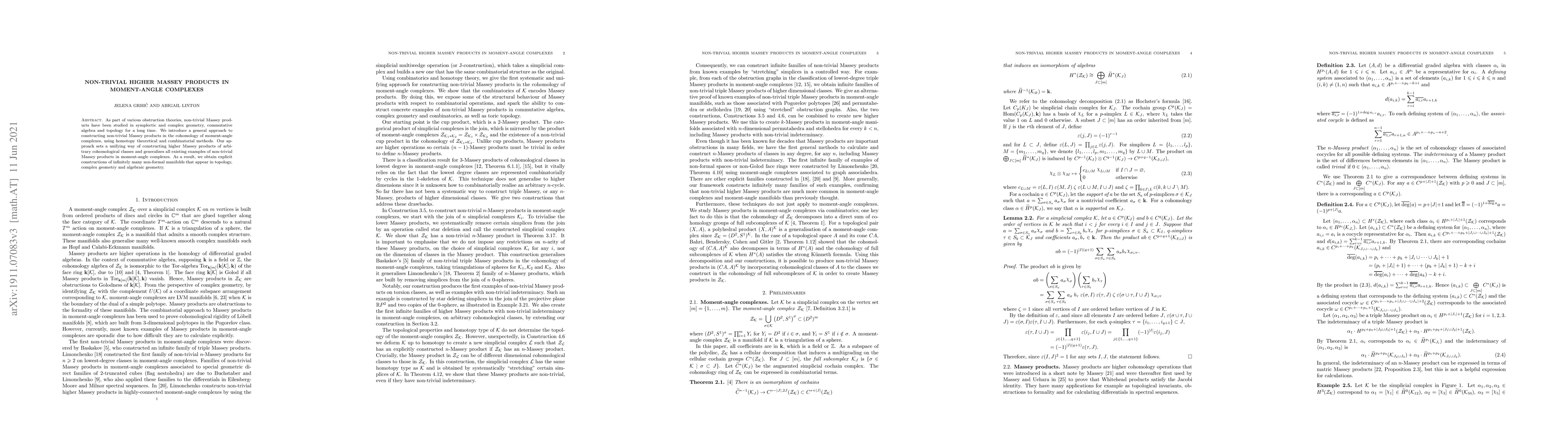 As part of various obstruction theories, non-trivial Massey products have been studied in symplectic and complex geometry, commutative algebra and topology for a long time. We introduce a general approach to constructing non-trivial Massey products in the cohomology of moment-angle complexes, using homotopy theoretical and combinatorial methods. Our approach sets a unifying way of constructing higher Massey products of arbitrary cohomological classes and generalises all existing examples of non-trivial Massey products in moment-angle complexes. As a result, we obtain explicit constructions of infinitely many non-formal manifolds that appear in topology, complex geometry and algebraic geometry.