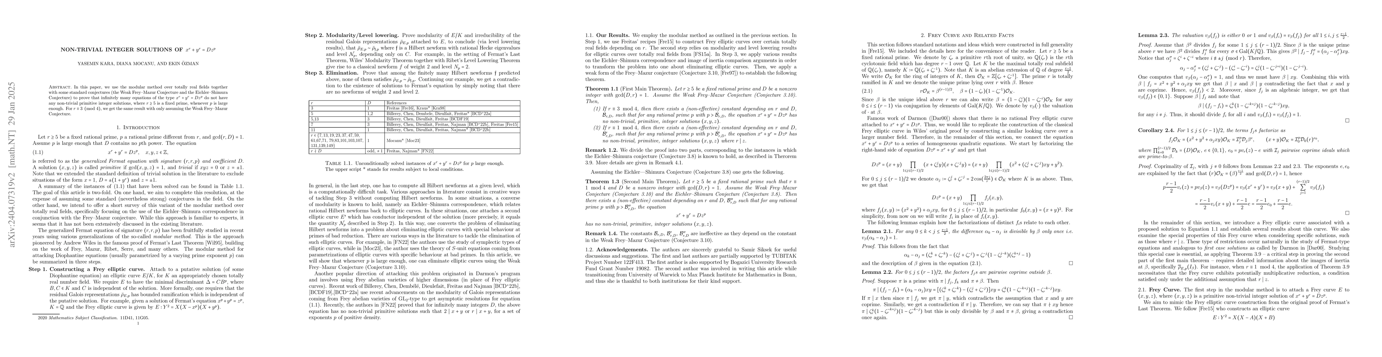 The paper introduces a novel approach to proving the non-existence of non-trivial primitive integer solutions for Fermat-type equations of the form $x^r+y^r=Dz^p$ by leveraging the modular method and standard conjectures.
