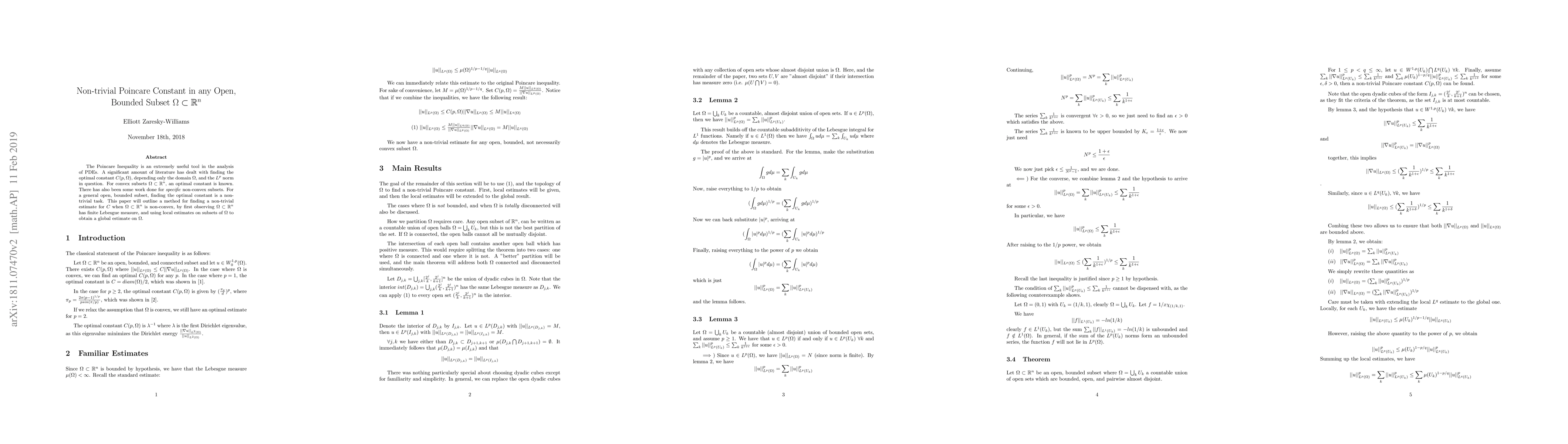 This paper presents a method to estimate the non-trivial Poincare constant for non-convex subsets of $\mathbb{R}^n$ by leveraging local estimates on subsets of $\Omega$ to derive a global estimate, given that $\Omega$ has finite Lebesgue measure.