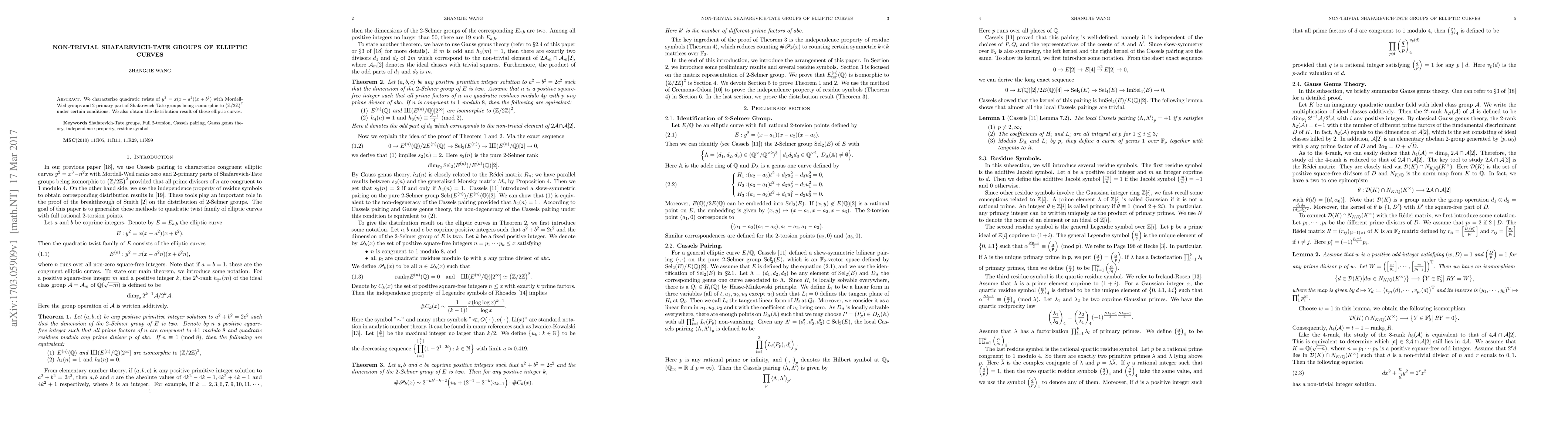 This paper characterizes quadratic twists of a specific elliptic curve with a particular form, showing that their Mordell-Weil groups and $2$-primary part of Shafarevich-Tate groups are isomorphic to $(\mathbb{Z}/2\mathbb{Z})^2$ under certain conditions. It also provides a distribution result for these elliptic curves.