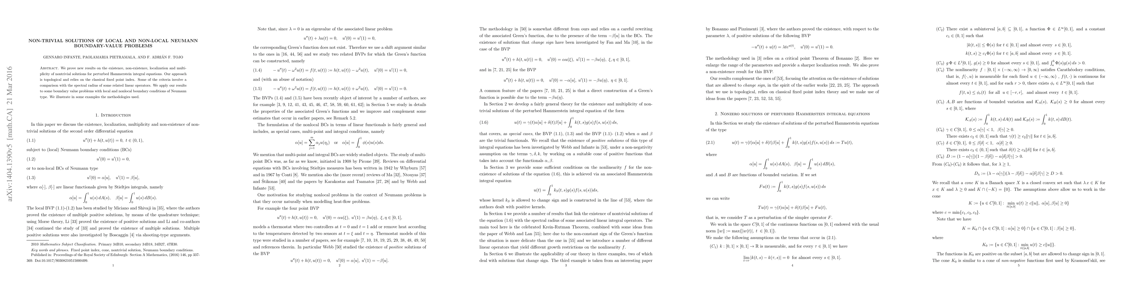 This paper proves new results on the existence and multiplicity of nontrivial solutions for perturbed Hammerstein integral equations, employing a topological approach based on the fixed point index. The study also applies these findings to Neumann boundary-value problems with local and nonlocal conditions, demonstrating the methods through illustrative examples.