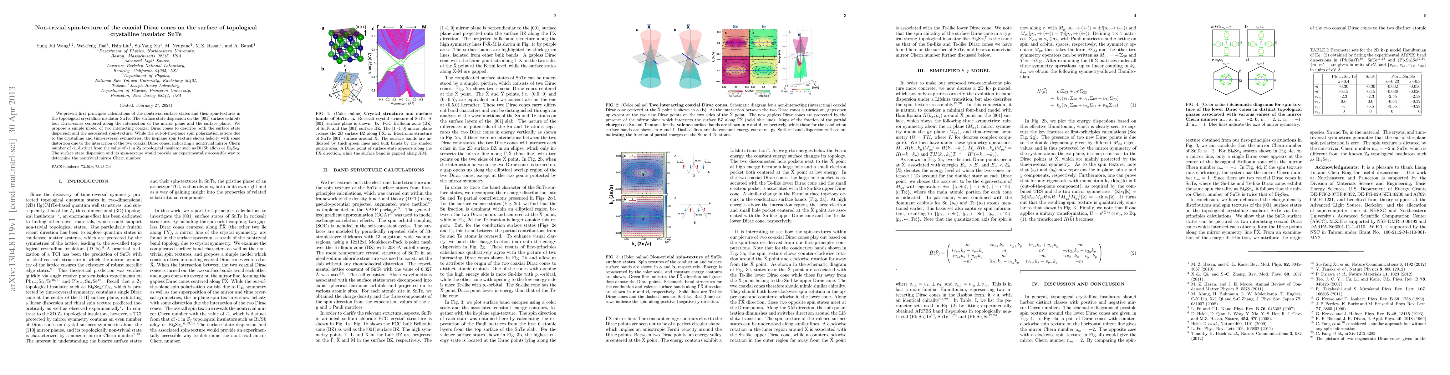 This paper presents first-principles calculations revealing the nontrivial spin-texture of four coaxial Dirac cones on the surface of SnTe, a topological crystalline insulator, showing a mirror Chern number of -2 due to in-plane spin helicity. This unique spin-texture provides an experimental method to determine the material's topological properties.